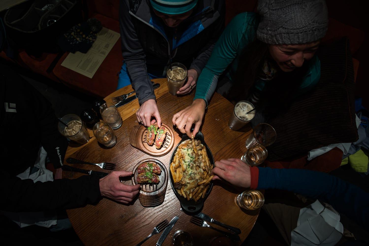 No matter how tired, excited, or worked our ski crew is, gathering together after a day on the slopes conjures a special magic all of its own. Maybe it’s the low lighting of a dive-y, rambunctious bar blasting live music from the stage that begs for a little booty-shaking, if your legs can take it. Maybe it’s the re-energizing plate of gooey nachos dug into by a half dozen smiling friends squished into a well-worn leather booth. Perhaps, more than anything, it’s the combination of storytelling, planning for tomorrow, and the recollection that it’s Saturday, so yeah, we should probably get another pitcher of Pako’s IPA.