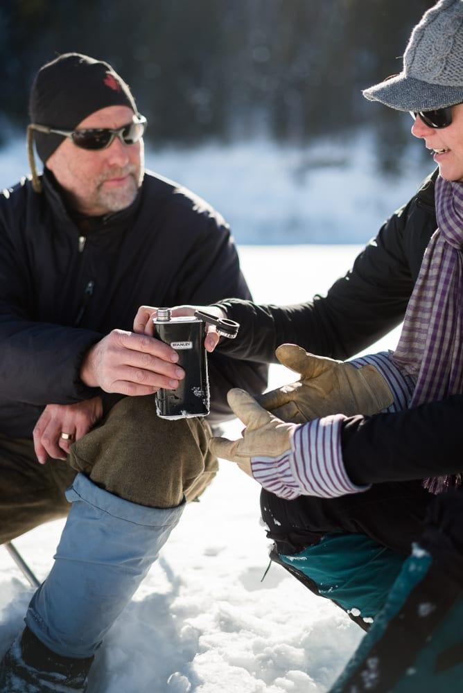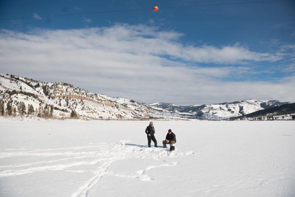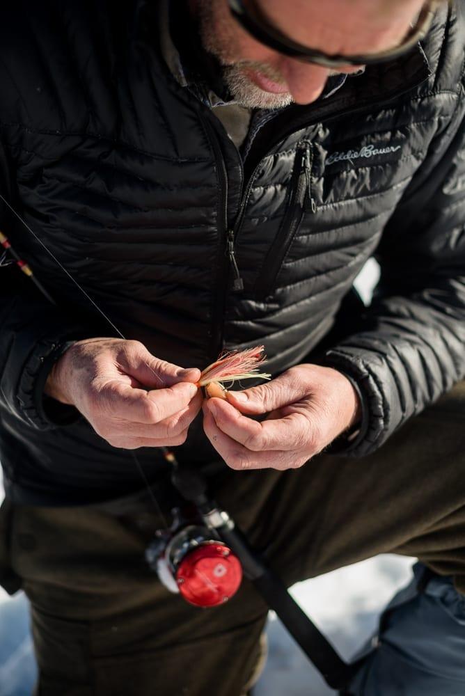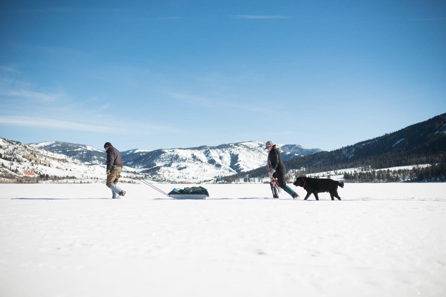 Though some rely on snowmobile to reach their favorite spots on the ice, we’ve always done it the old-fashioned way. If the snow is especially fluffy and deep, snowshoes make traversing the path easier, but often aren’t needed. The sharp winter winds that race through the valley at night keep the layer of snow on the wide open lakes shallower than elsewhere.