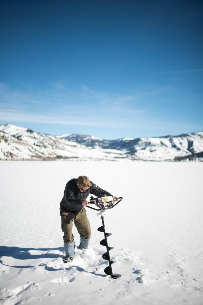 With a location selected, it’s time to drill holes through the ice. Historically, these augers were hand-powered, and boring through fourteen inches of ice was no small task. These days, a gas-powered auger punches through with ease. The stark white of the lake’s expanse is punctuated by these holes: the sides glow in shades of unearthly teal and blue around the black depths below.