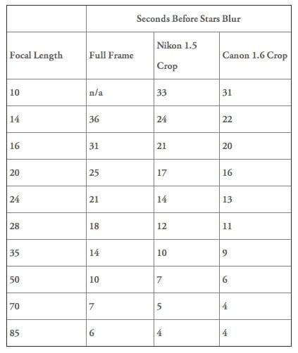 For getting a correct exposure there are a few rules of thumb here that will be helpful. In these photos you will notice that there are no ‘star trails’. Star trails occur when you have the shutter open long enough to record the rotation of the earth. Because the earth is moving relative to the stars the result is that the stars will create a ‘trail’. For my images I prefer to capture the brilliance of the night sky without the trail affect so this is where I have to be very careful with how I select my lens and shutter speed. (f-stop and ISO settings also come into play here) For shutter speed I use the ‘500 Rule’. 500 Divided By the Focal Length of Your Lens = The Longest Exposure (in Seconds) Before Stars Start to “Trail” So let’s say you’re using a 14mm lens on a full frame camera. 500 / 14 = 36 seconds. Using a 14mm lens I can shoot a 36 second exposure without the stars ‘trailing’. You then have to choose the proper f-stop and ISO settings to determine the optimal exposure. Full disclosure – I found out about the 500 rule by searching the interweb. There are tons of sites out there with far more technical info if you really want to geek out. For example I found this post with the following chart to help simplify your lens/shutter speed combo.