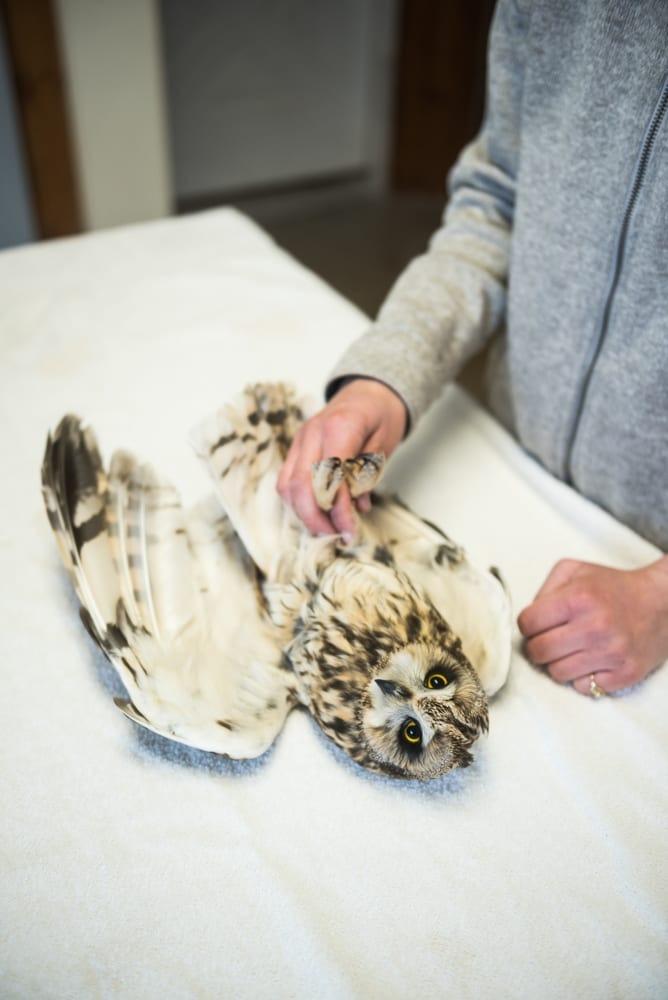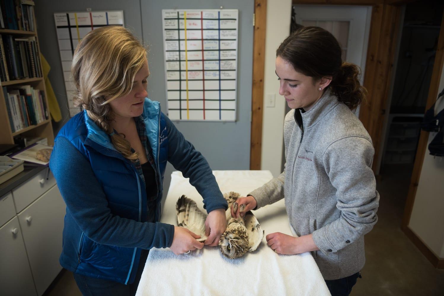 Meghan Warren and Sarah Ramirez work with an injured short eared owl. This fella was brought in all the way from Rock Springs, WY. With luck he’ll be back out in the wild soon.