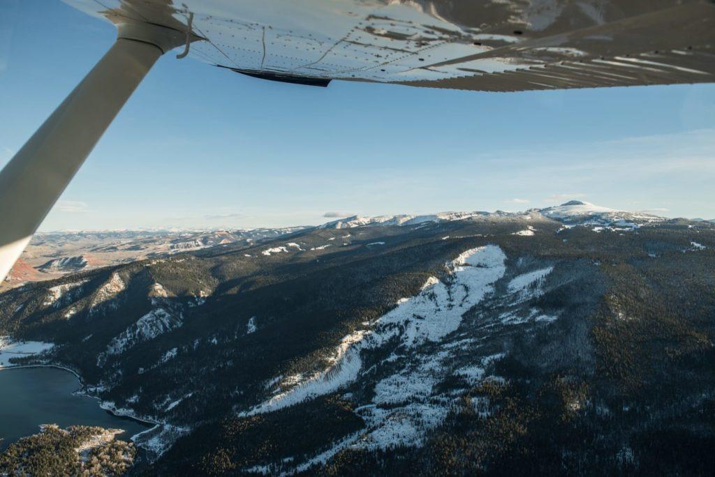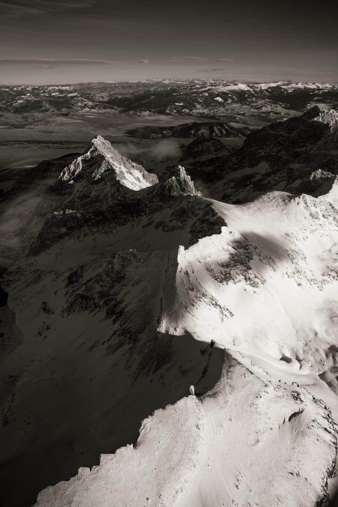 As the plane gently climbed, the Gros Ventre River became a thin, shimmering ribbon. Peter turned us south, and we swept by the snow-crusted summit of the Sleeping Indian. From the valley floor, the formation looks deceptively like a single wall of stone. At 12,000 feet, it was clear that two distinct peaks comprise the iconic mountain. Ridges iced with smooth, clean snow stretched as far as we could see. Teton County is comprised of only 2% private and developable land; from this altitude, it was clear just how much wilderness we have kept wild.