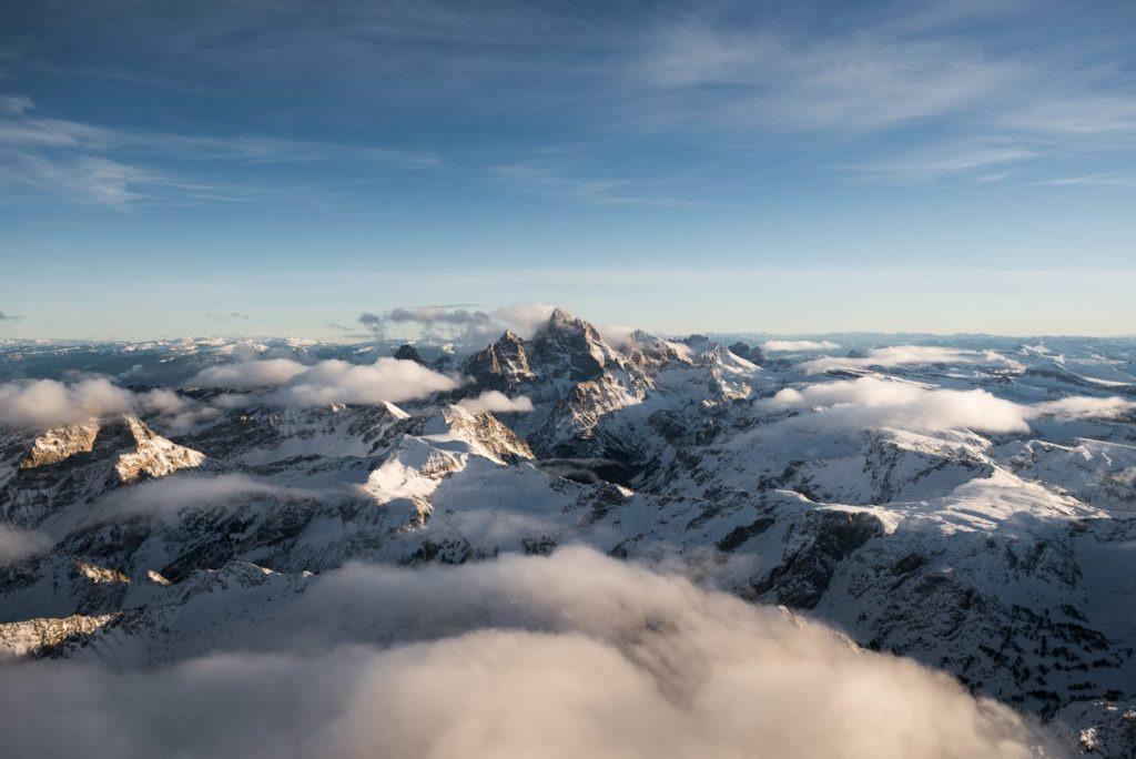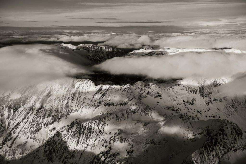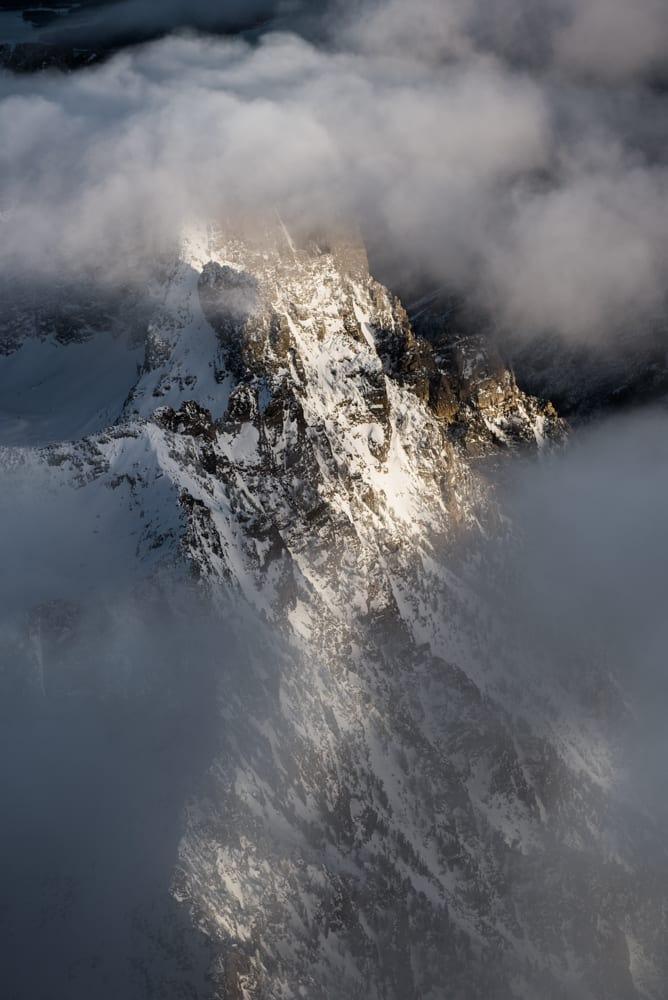 Gossamer clouds slid between the crags, and the early evening sun illuminated the cliffs and snowy saddles. Soaring among the peaks was more expansive and astounding than the view from one of their singular summits. Countless white valleys and ridges below looked soft and peaceful, like pillowy folds of a blanket.