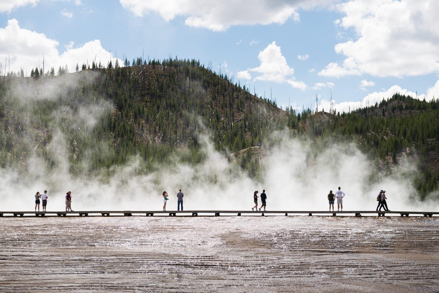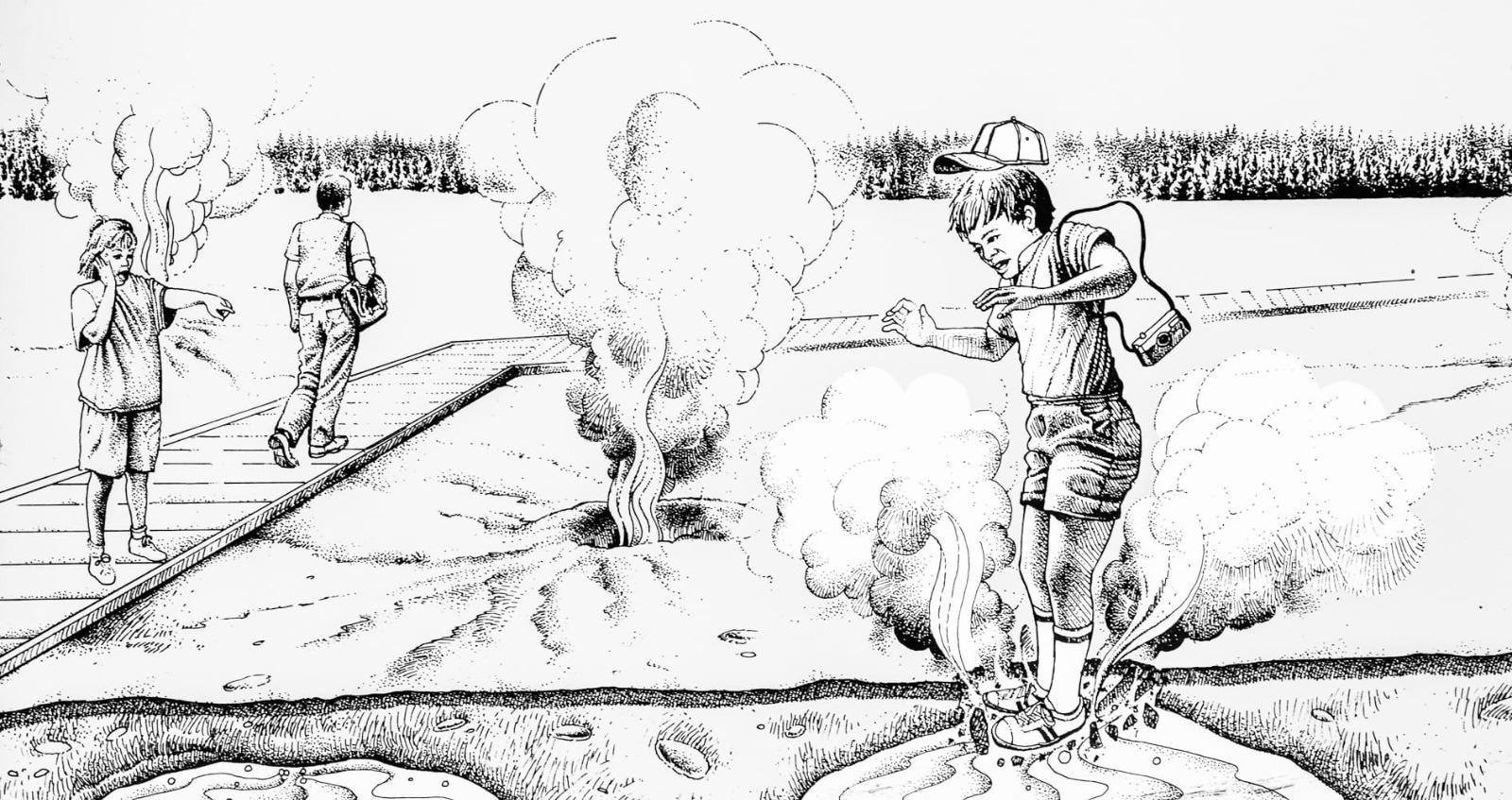 This illustration found on the signs at Grand Prismatic Springs in Yellowstone NP warns visitors of the hazard of stepping off the boardwalk.