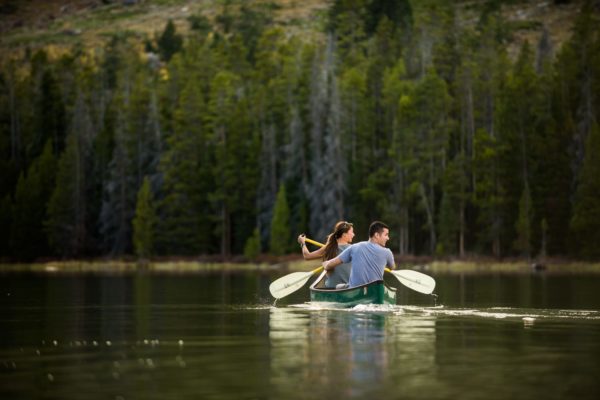 Each stroke of the paddle westward propels the little vessel past the fir-lined shore, closer to the mountains than before. The paddlers fall into an easy rhythm, correcting their course every few strokes. In the tranquility even the gentlest shifts of light are startling as the stern Cascade Canyon cliffs become sharper and more pronounced. As our steady paddling passes time along, the morning imperceptibly blossoms into daytime; the lake water takes on a new hue of blue as the sun intensifies.