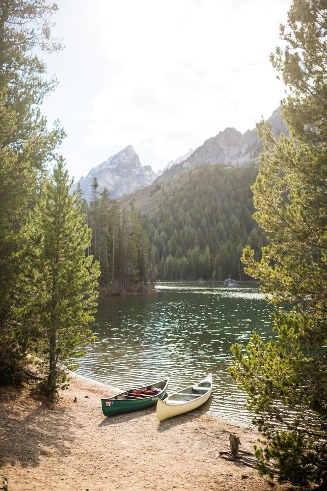 The inlet stream at String Lake bubbles forth under a low wooden bridge, continuing its slippery southbound journey to Jenny Lake, the next of these shimmering liquid emeralds. Although most visitors are drawn, understandably, to the seemingly endless (and epic) hiking opportunities in the area, accessing the Tetons by boat offers a unique perspective into the quieter corners of the park. While it is impossible to paddle all the lakes successively, short portages make exploring clusters of them a rewarding endeavor. From the canoe, quietly sliding across the water, the mountains reveal subtleties not visible from the forested intimacy of the hiking trails.