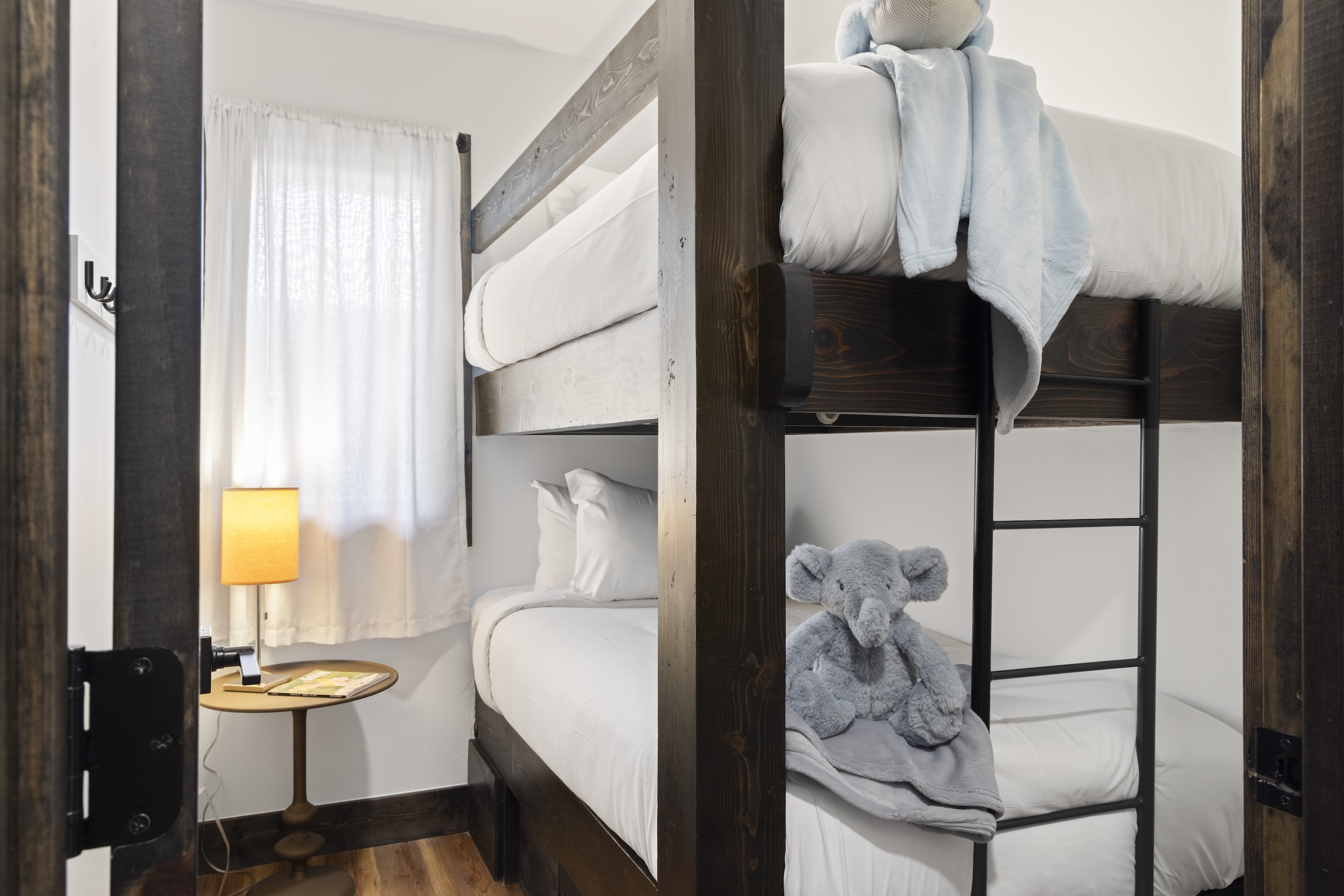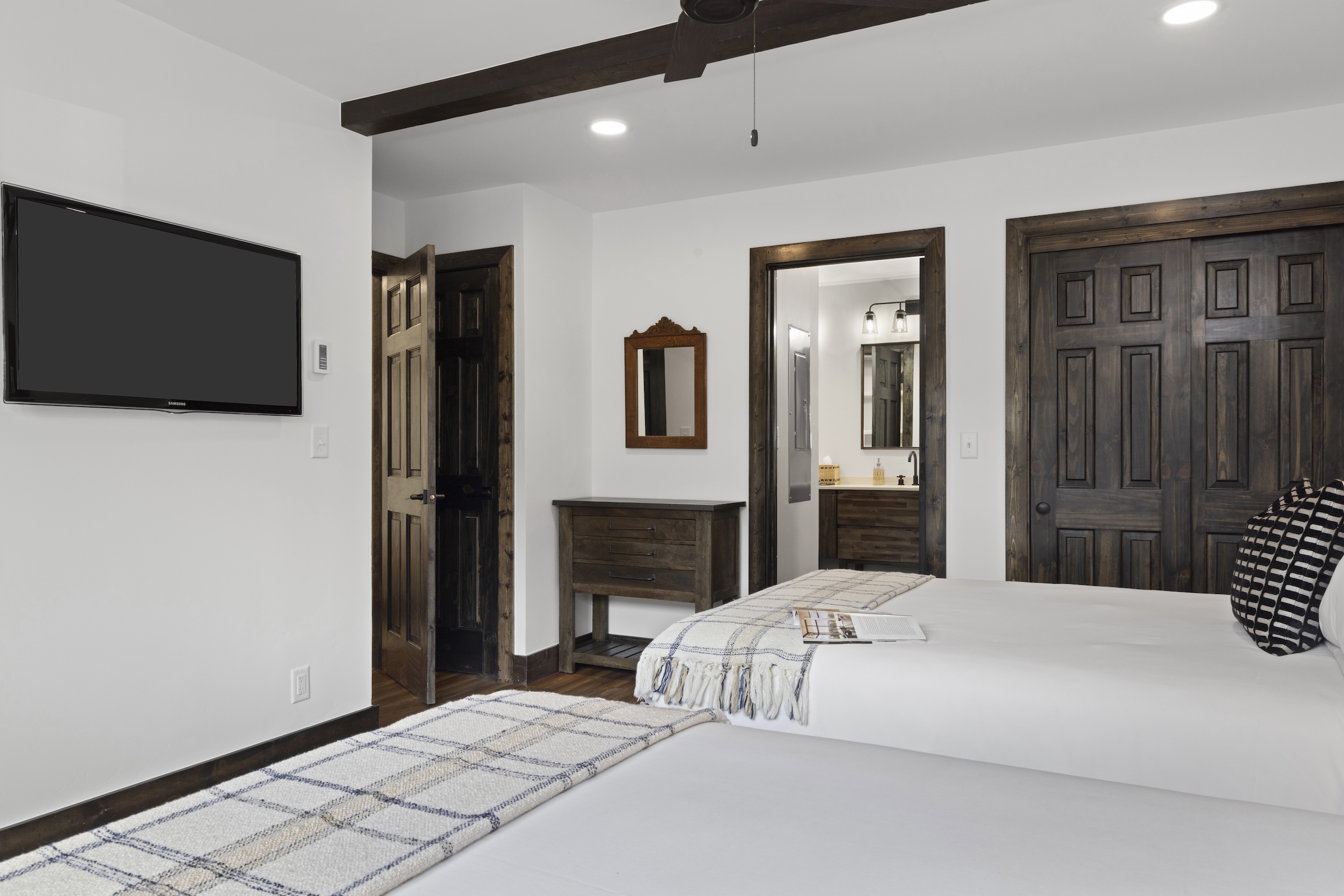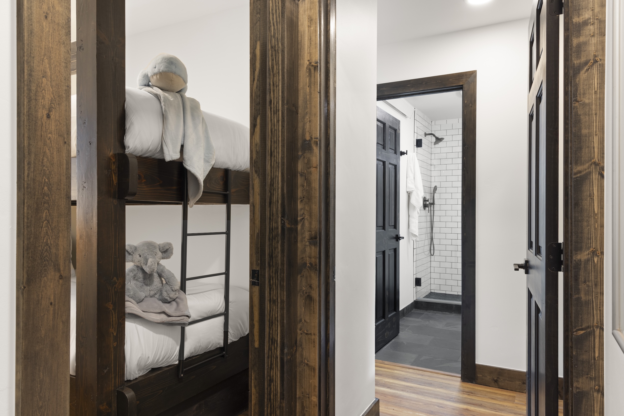 Cheeky’s Mountain Oasis comfortably sleeps eight guests in real beds — no pull-outs here! The primary suite is adorned with a king bed, large closet, dresser, and a private en-suite bathroom. Two Queen beds, generous storage, and a private en-suite bath can be found in the guest bedroom. In the bunk room you will find twin bunk beds, perfect for kids or extra guests. A full-size washer and dryer are conveniently tucked away in the guest bathroom for easy mid-stay refreshes.