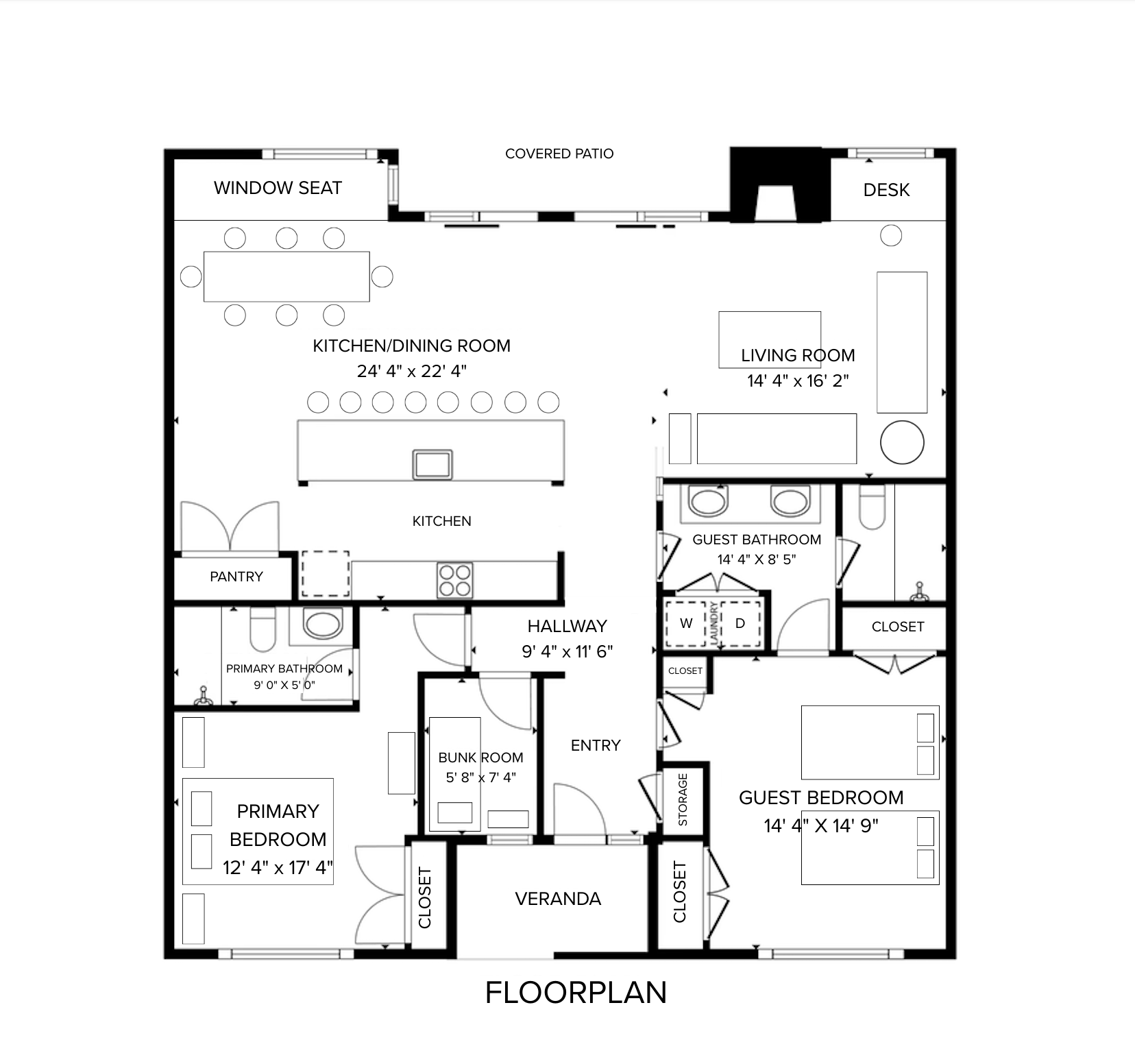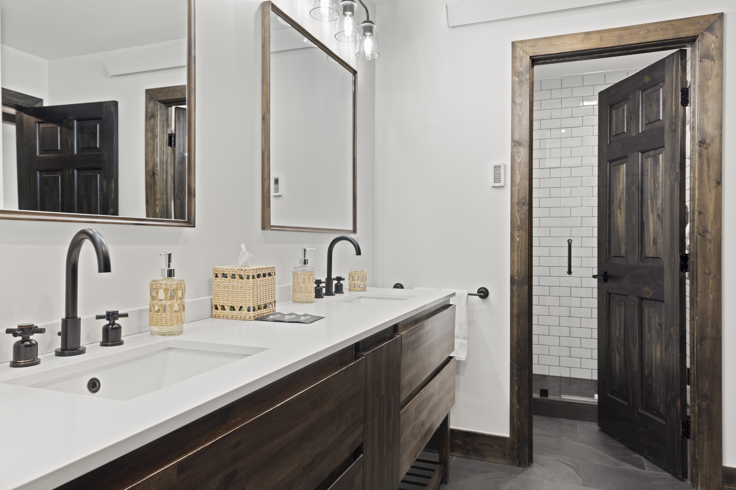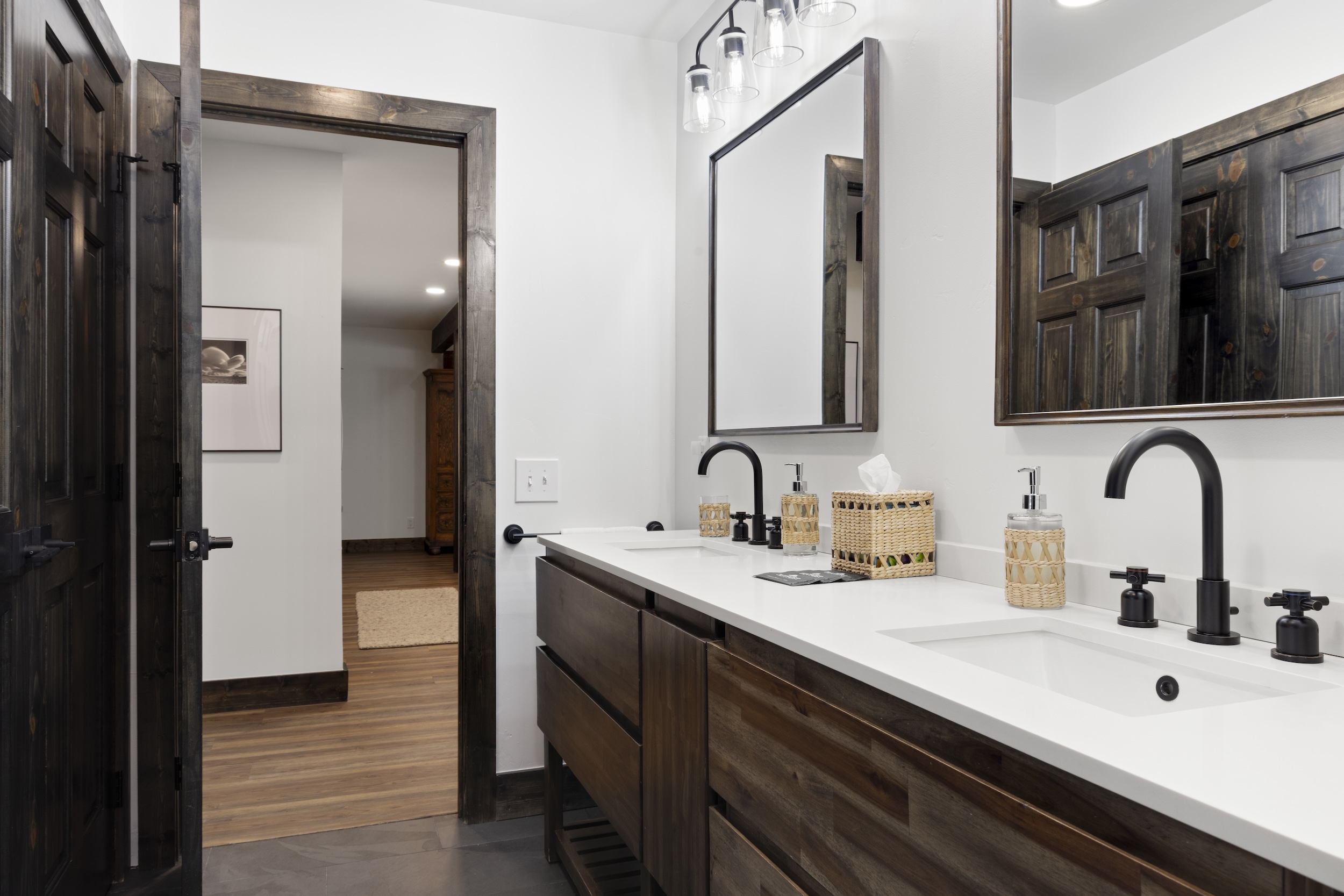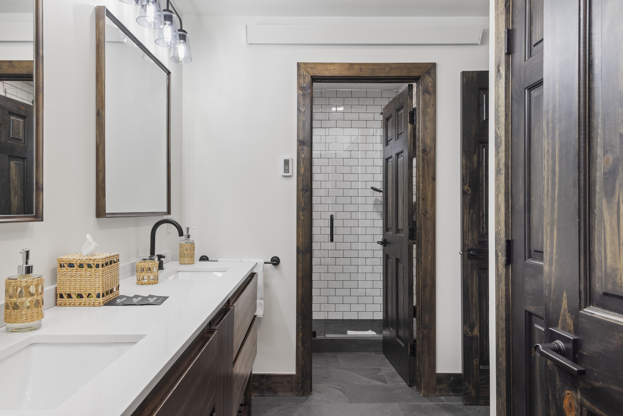 Cheeky’s Mountain Oasis comfortably sleeps eight guests in real beds — no pull-outs here! The primary suite is adorned with a king bed, large closet, dresser, and a private en-suite bathroom. Two Queen beds, generous storage, and a private en-suite bath can be found in the guest bedroom. In the bunk room you will find twin bunk beds, perfect for kids or extra guests. A full-size washer and dryer are conveniently tucked away in the guest bathroom for easy mid-stay refreshes.