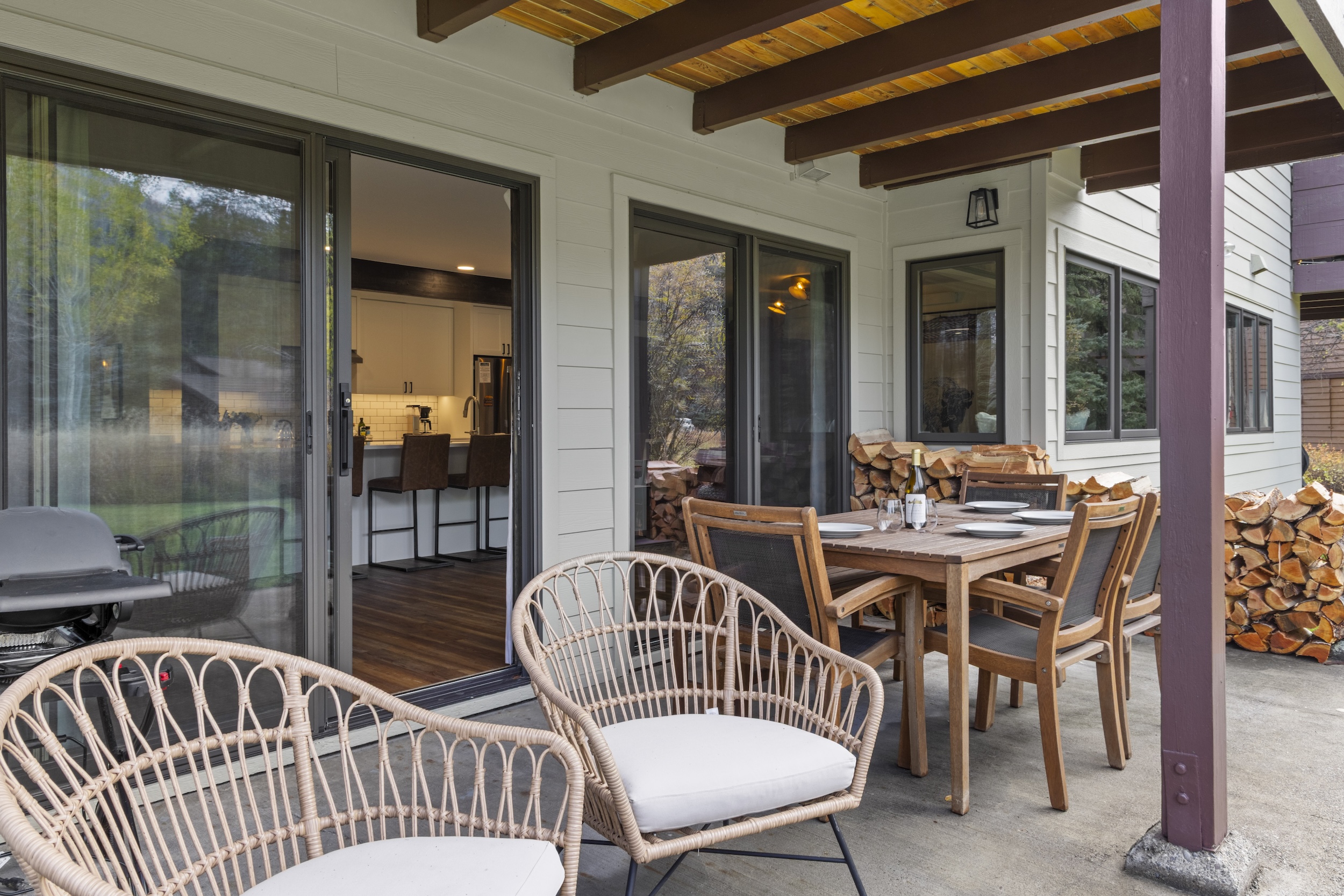 Step inside and feel instantly at ease. The open-concept living, dining, and kitchen areas create a welcoming flow, ideal for gathering and connection. The chef’s kitchen is fully equipped with high-end appliances, sleek quartz countertops, and a spacious island that invites group cooking, casual breakfasts, and late-night snacks. Sliding glass doors open to a covered patio, perfect for sipping morning coffee, enjoying al fresco dinners, or stargazing beneath Wyoming’s vast night sky. Fire up the electric grill for mountain cookouts, and take in the peaceful sounds of nature from the flat, grassy lawn—a year-round invitation for snowball fights, games, or wildlife spotting.