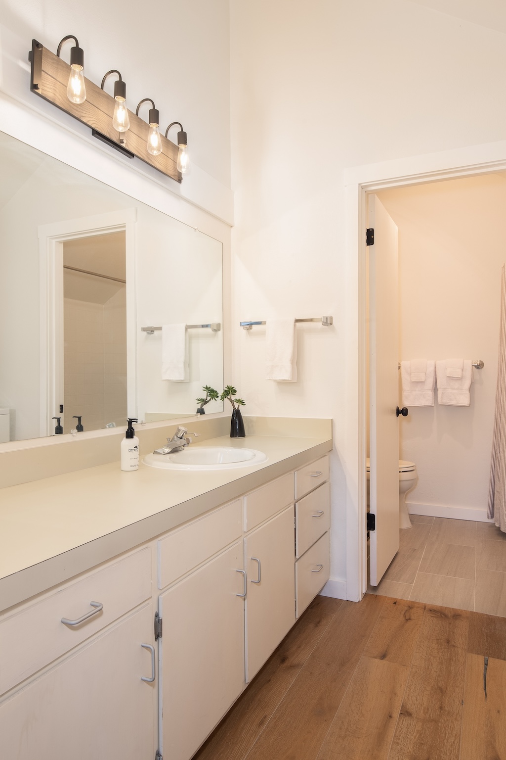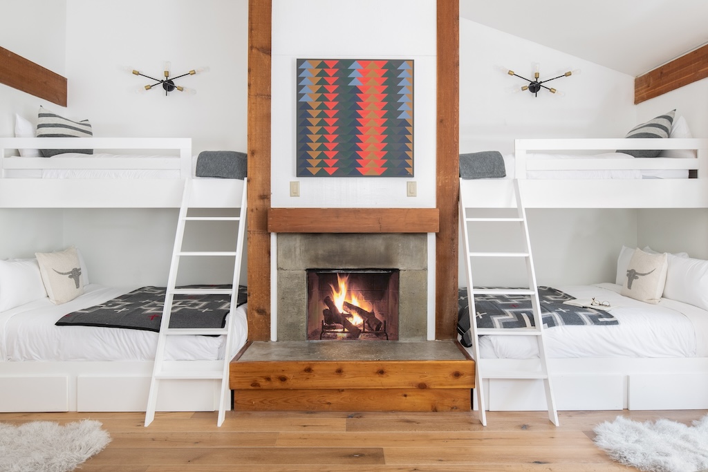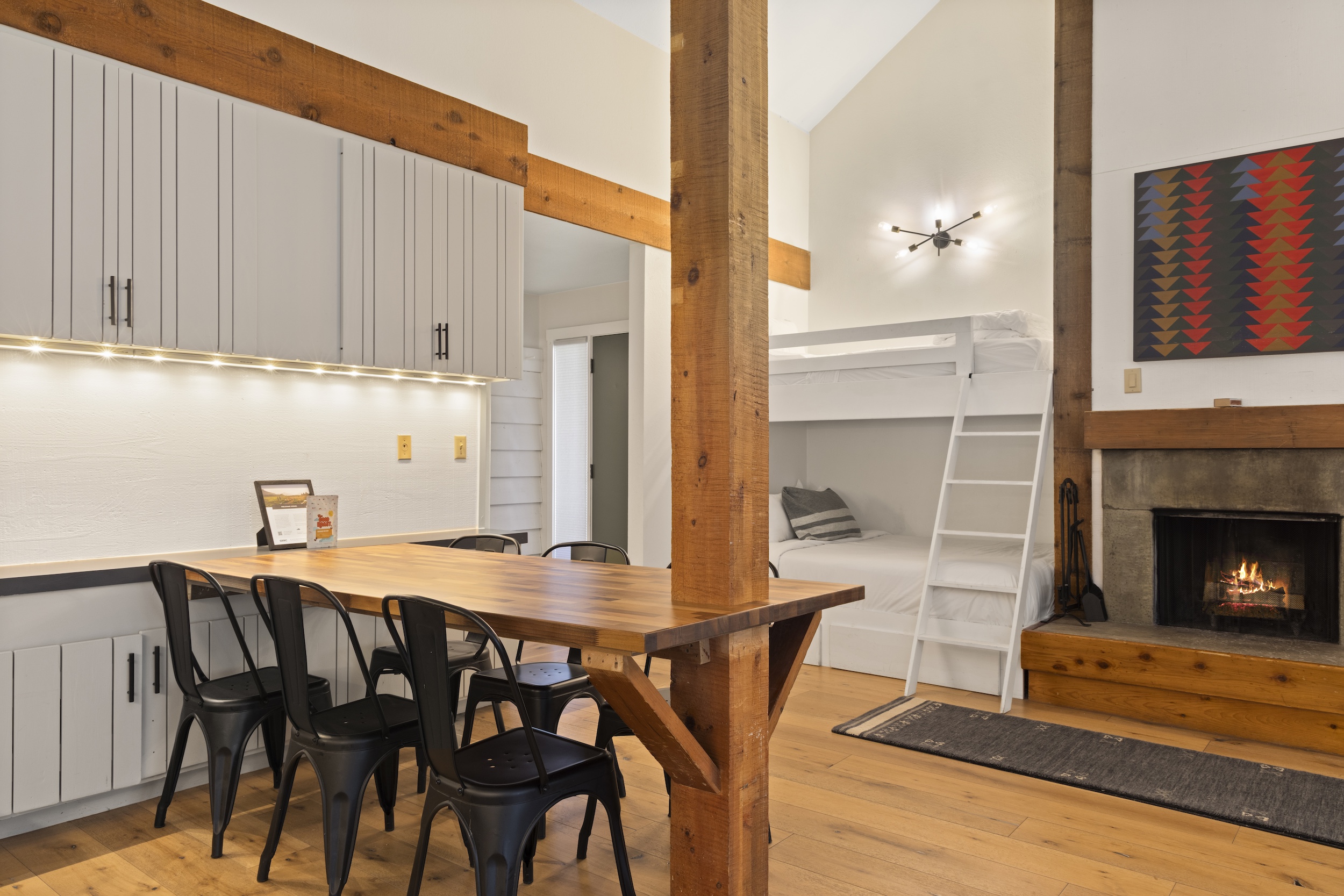 The space features a coveted open layout with a dining table for six, a comfortable living room with a wood-burning fireplace, a cozy sectional with swivel chairs, a bay-window nook, private deck, full bath with tub, laundry, and four beds. WiFi and flatscreen cable/streaming TV included.