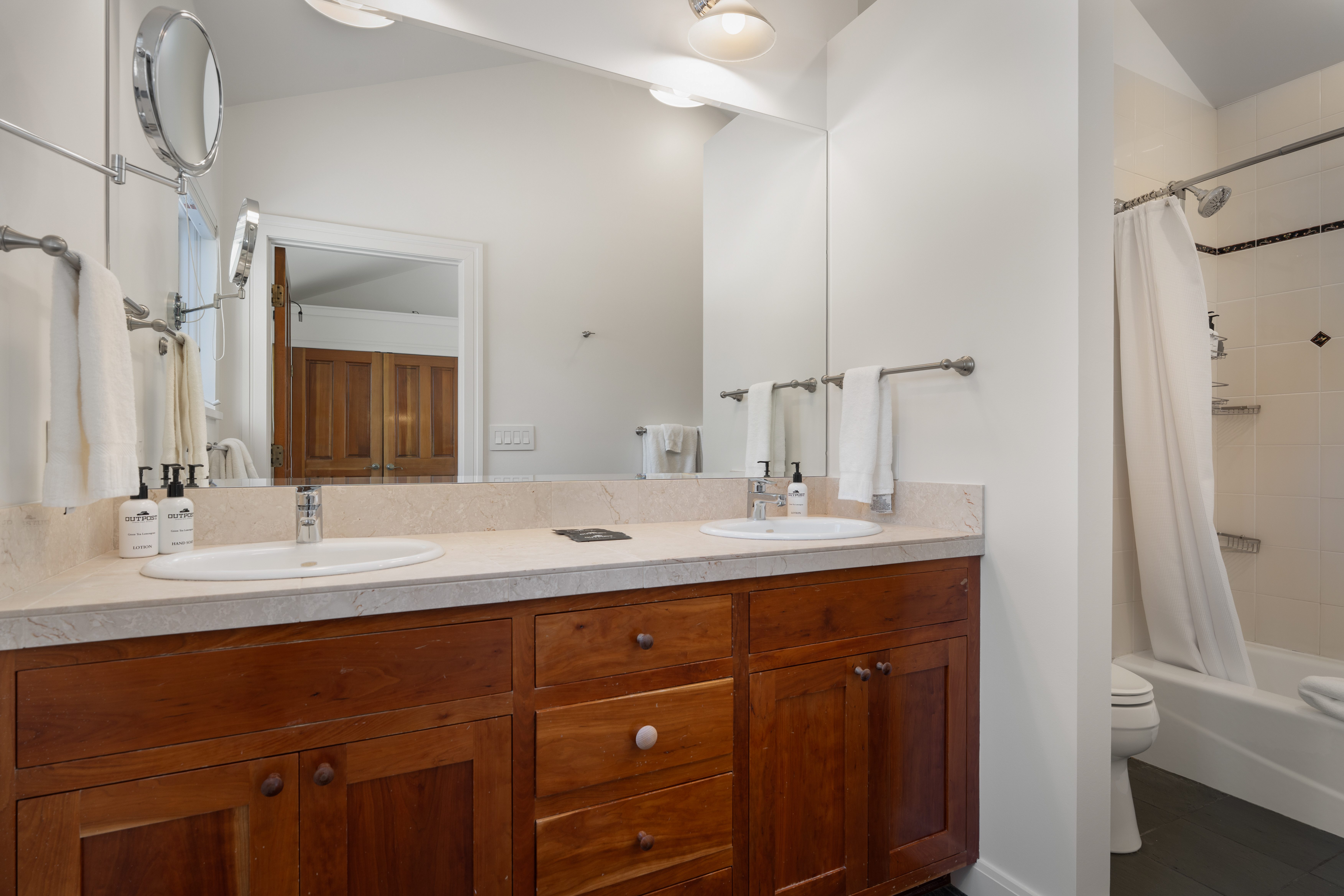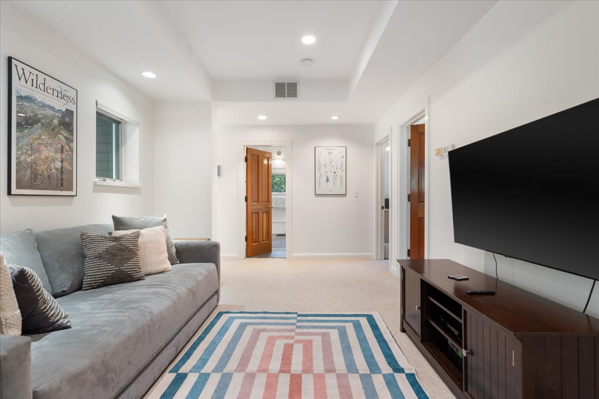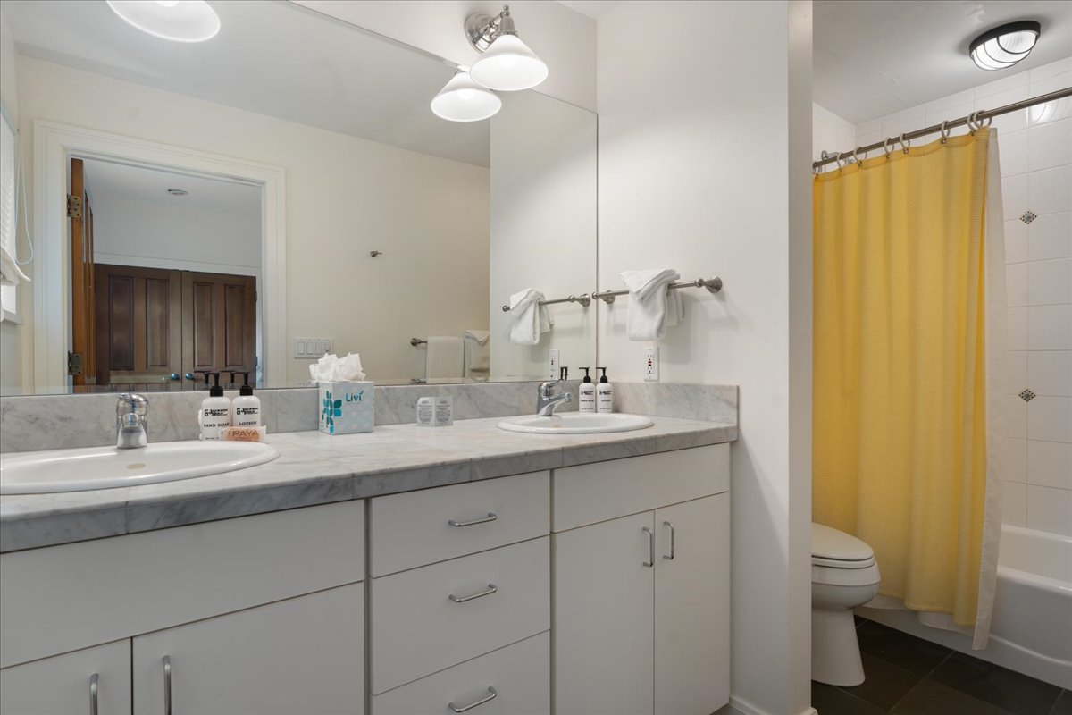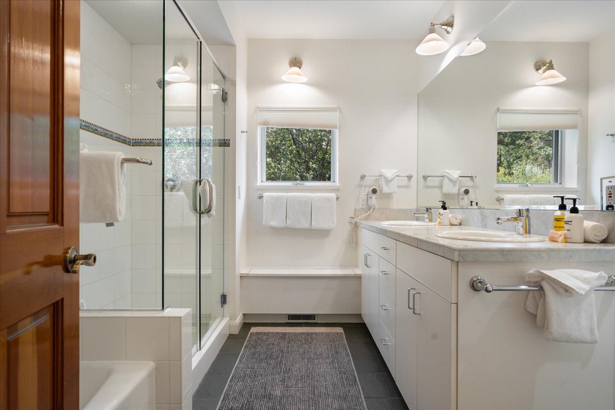 The property spans approximately 4,350 square feet and features six bedrooms across the main home and a guest house with a private exterior entrance, making it perfect for families or groups traveling together. The open living areas are filled with natural light creating a warm and inviting space to relax and gather.