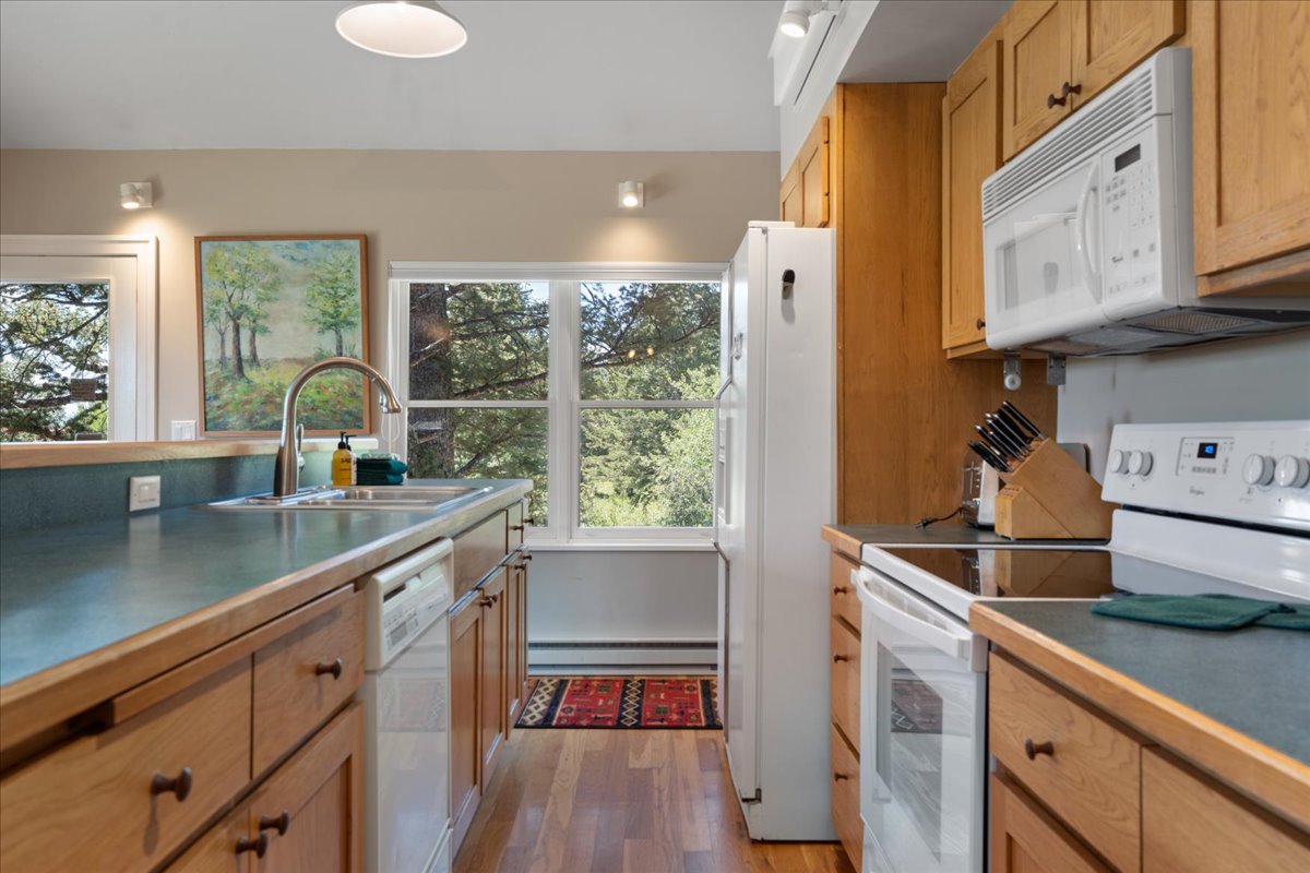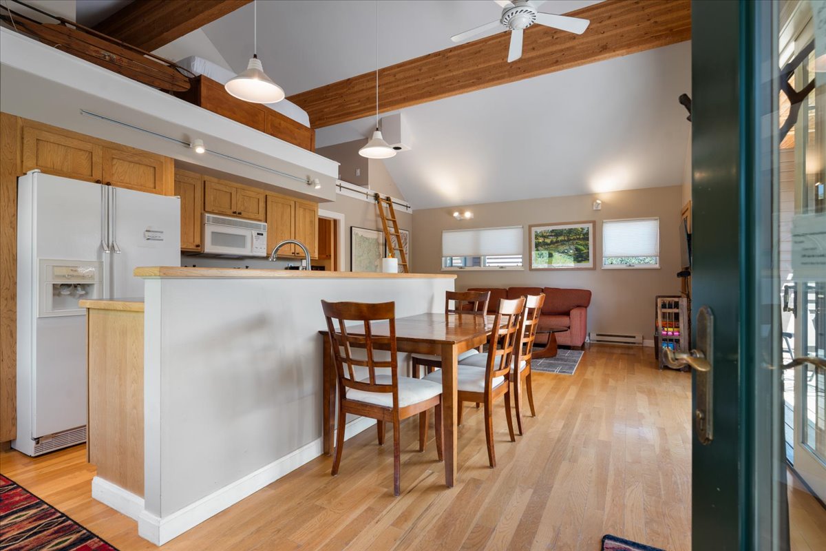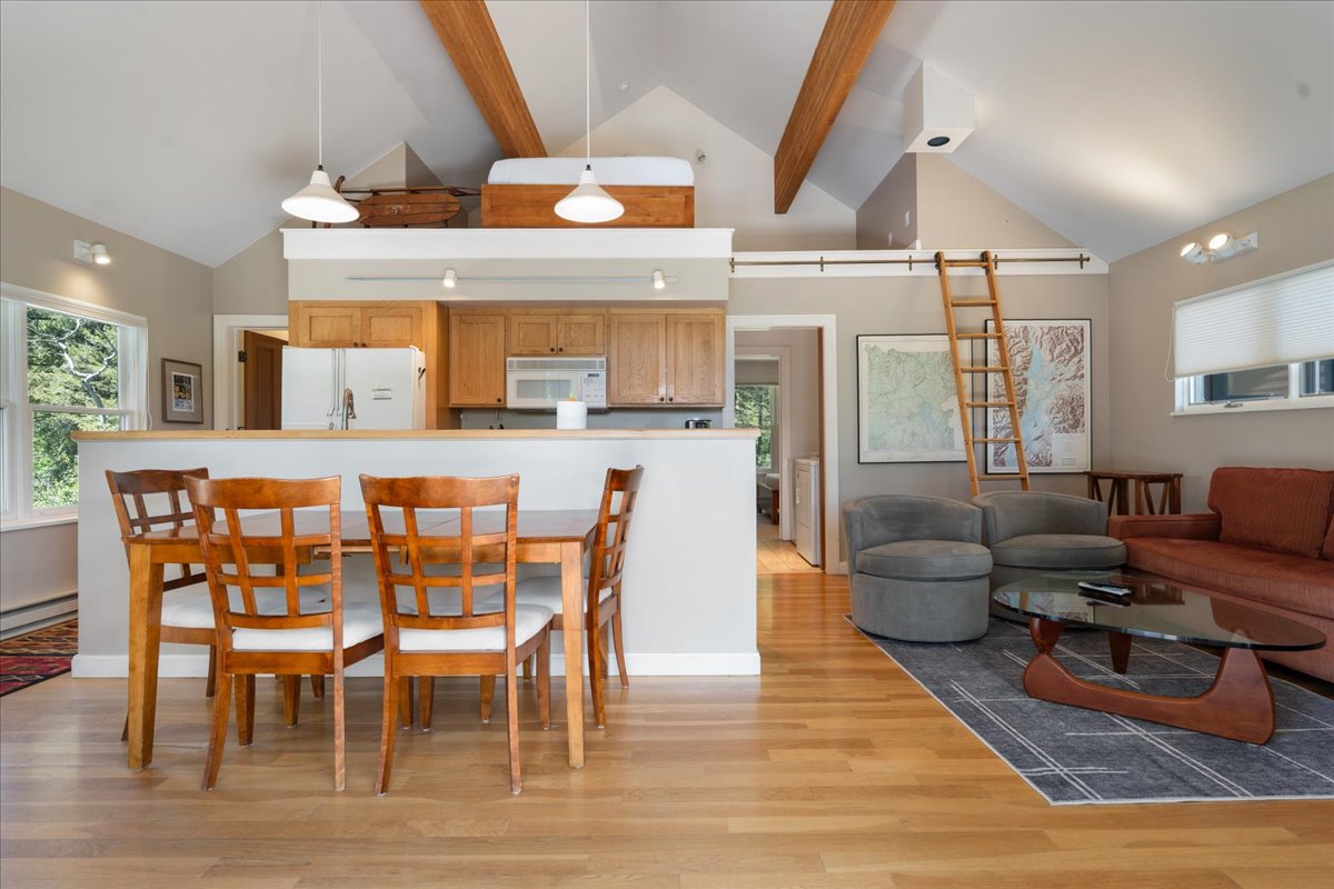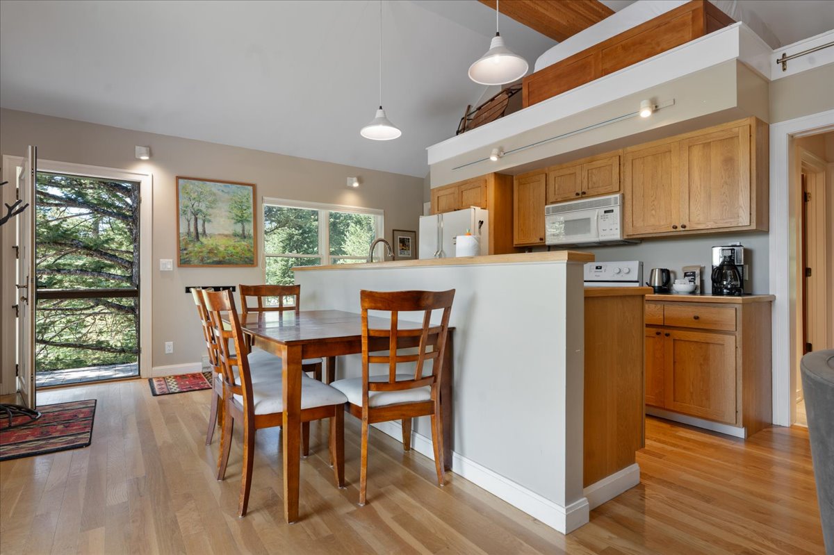 The fully equipped kitchen and spacious dining area make meals easy, whether enjoyed indoors or outside on the deck.