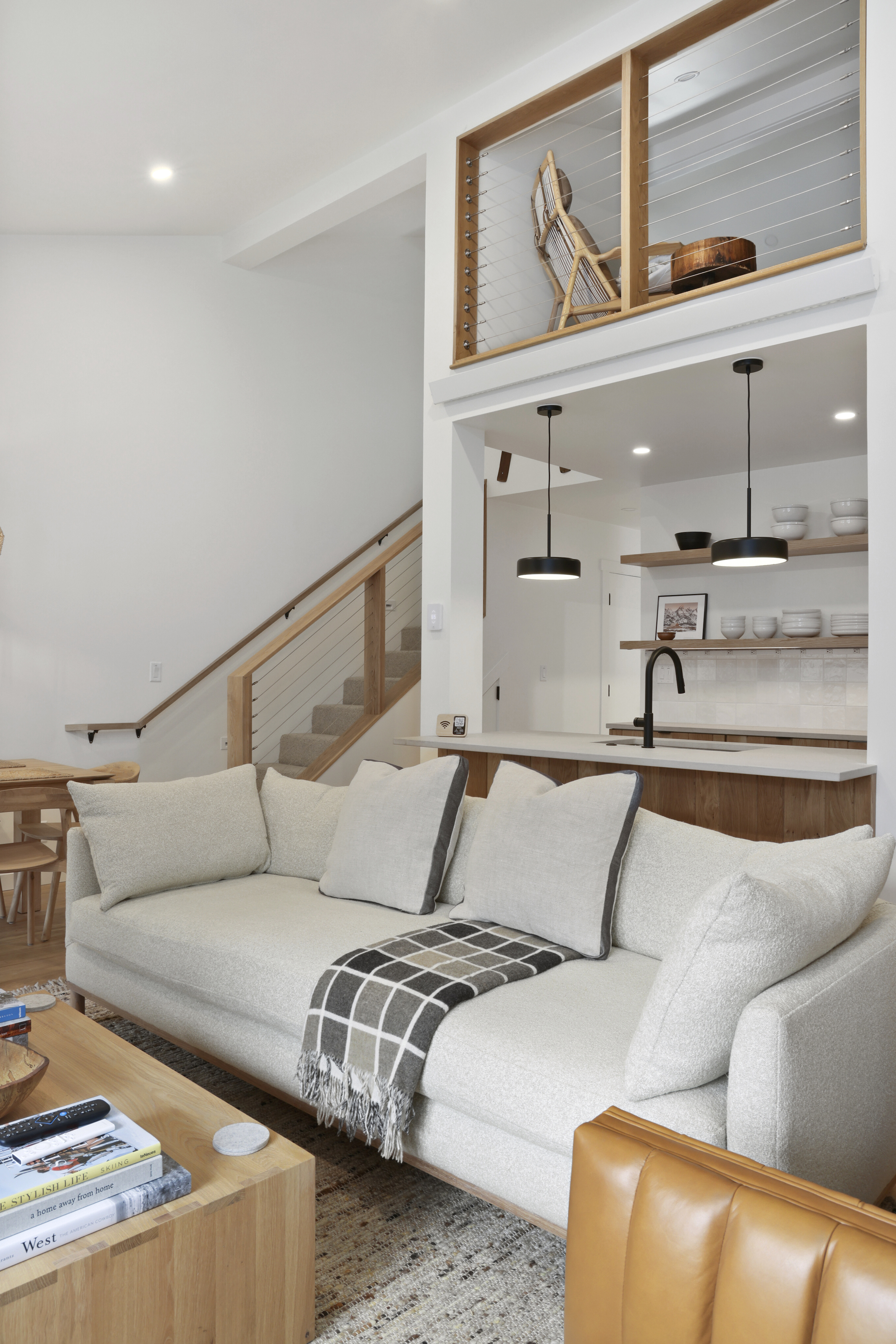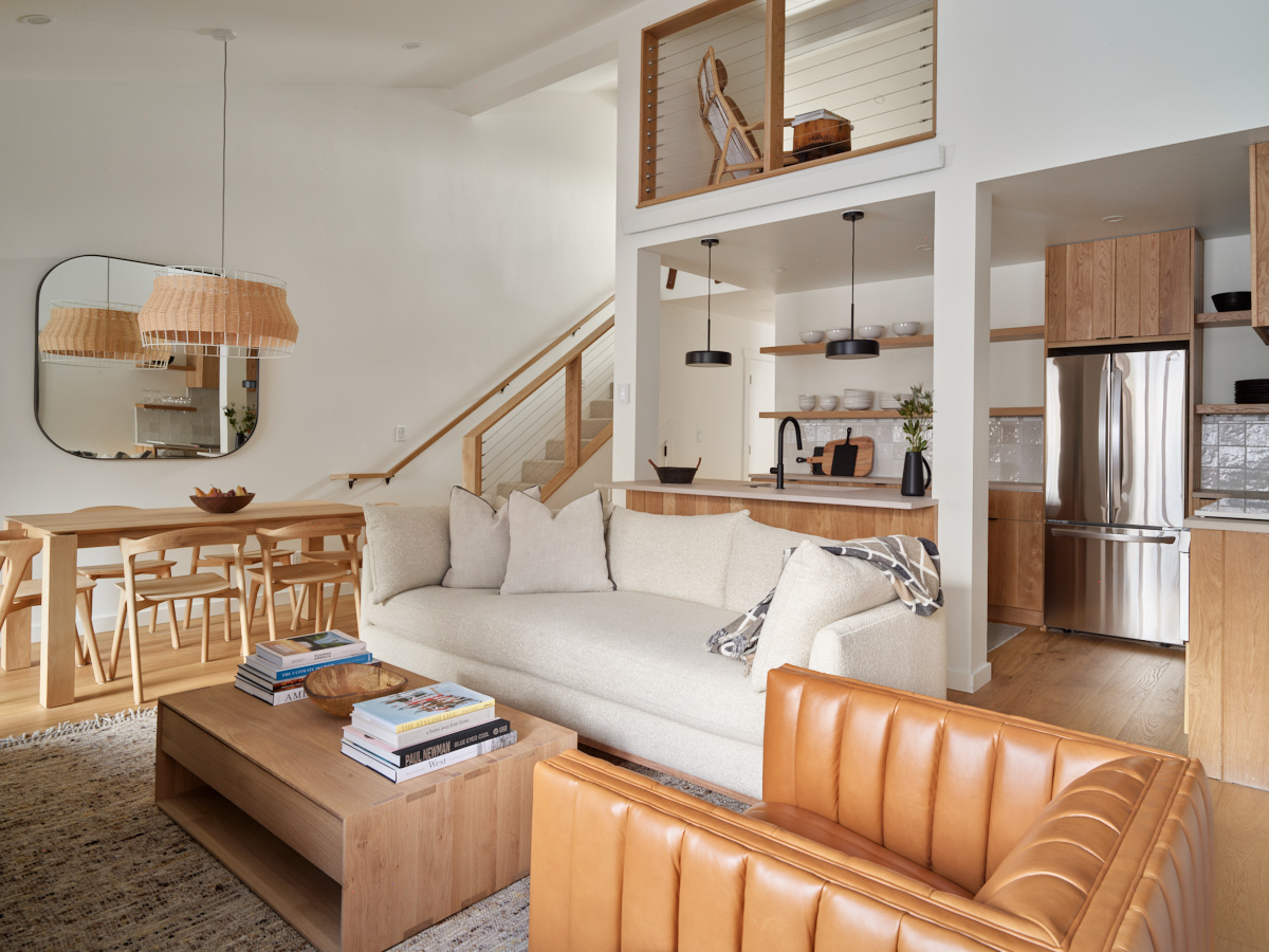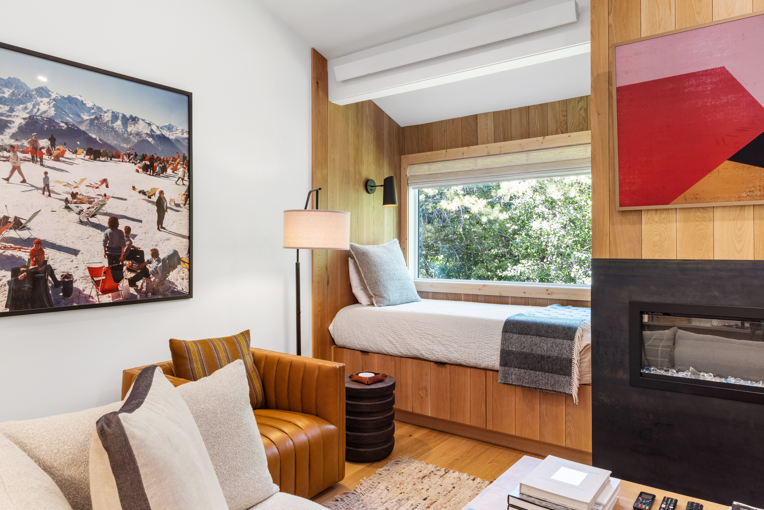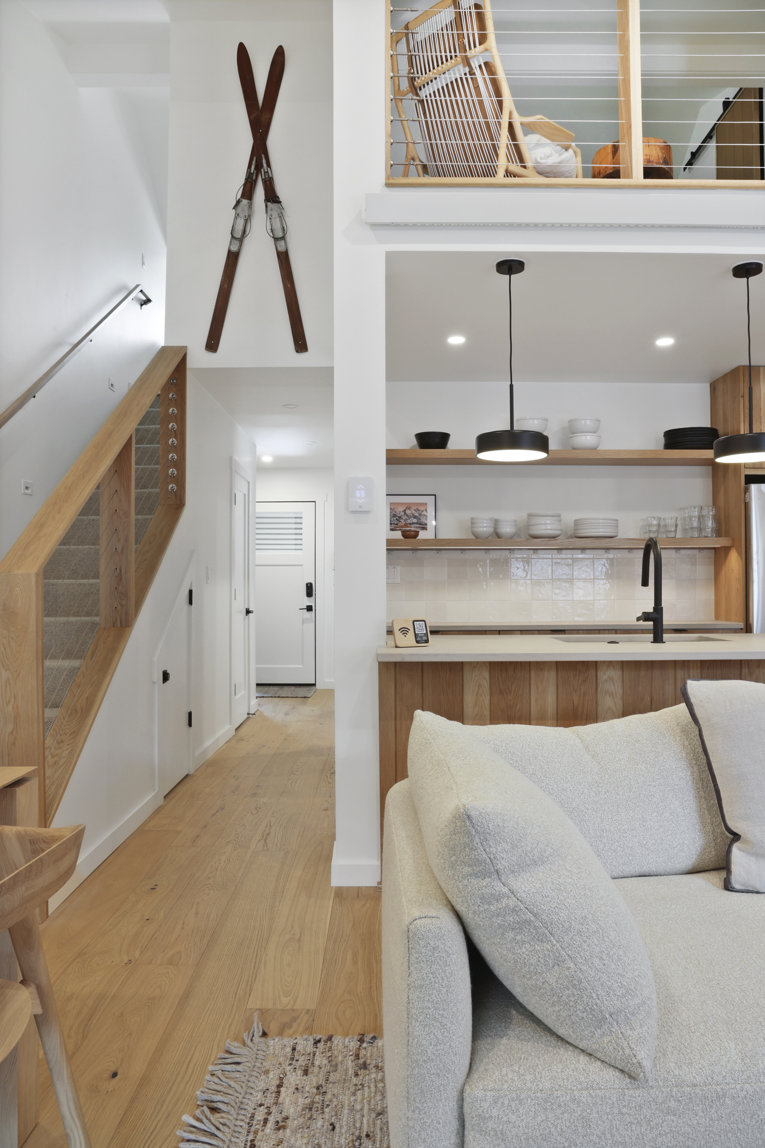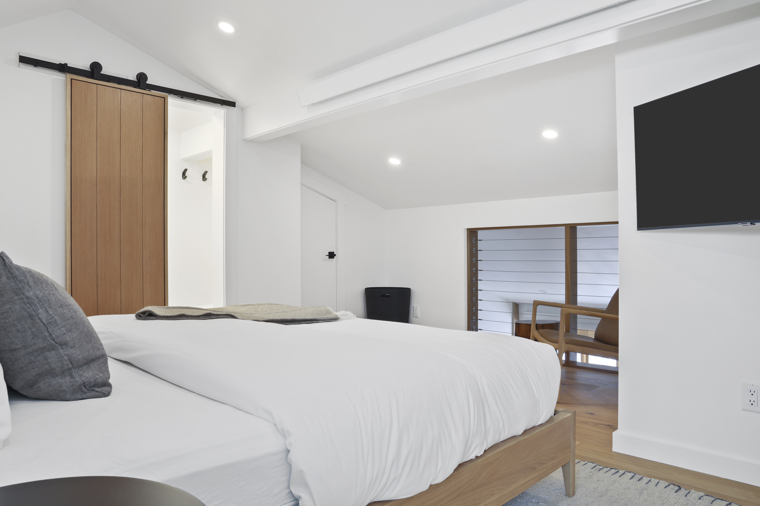 The queen guest bedroom is located on the main level of the home, with an adjacent bathroom. Upstairs, the primary bedroom features a king bed and an ensuite bathroom along with a small sitting area. Please note that the far bedroom wall by the sitting area is open to the main living room, which will allow some noise transfer. A privacy shade has been installed in the window overlooking the living room from the primary bedroom. The living room also provides a twin daybed that can be used as additional sleeping space.