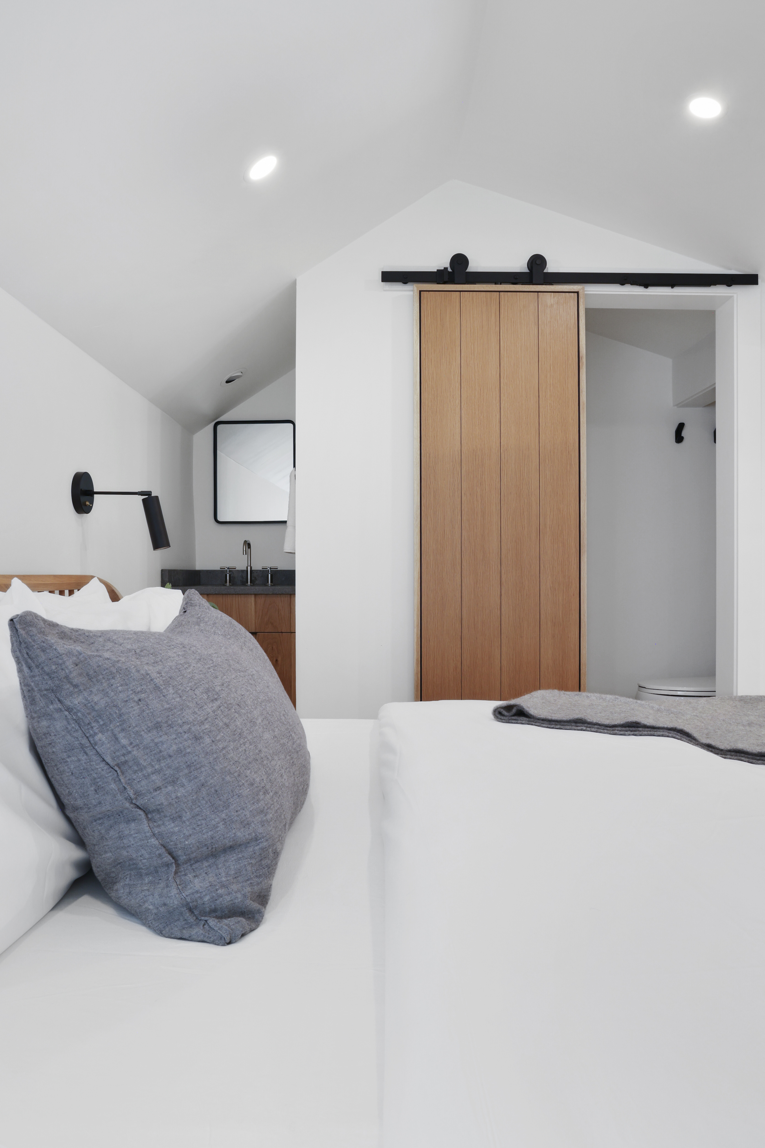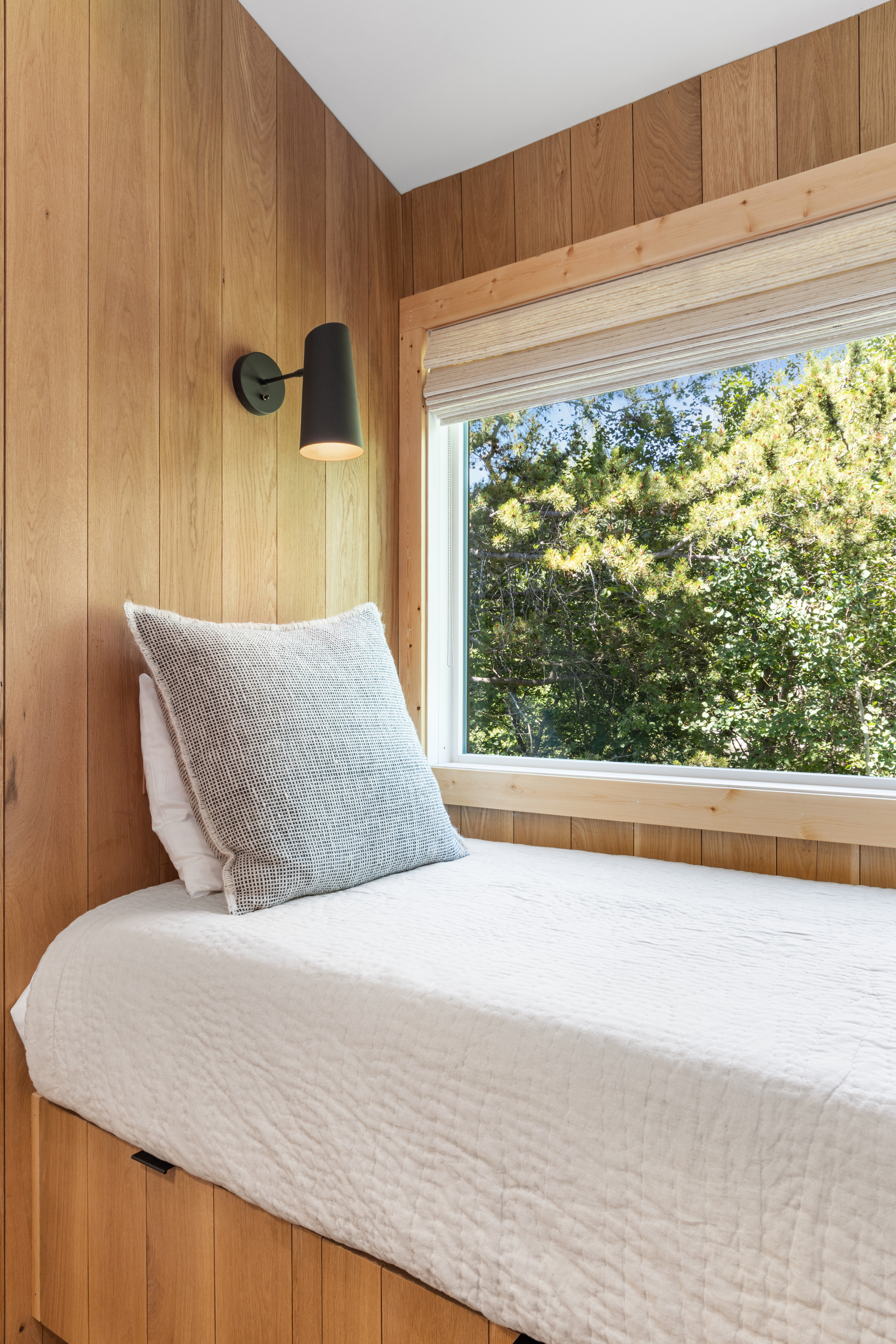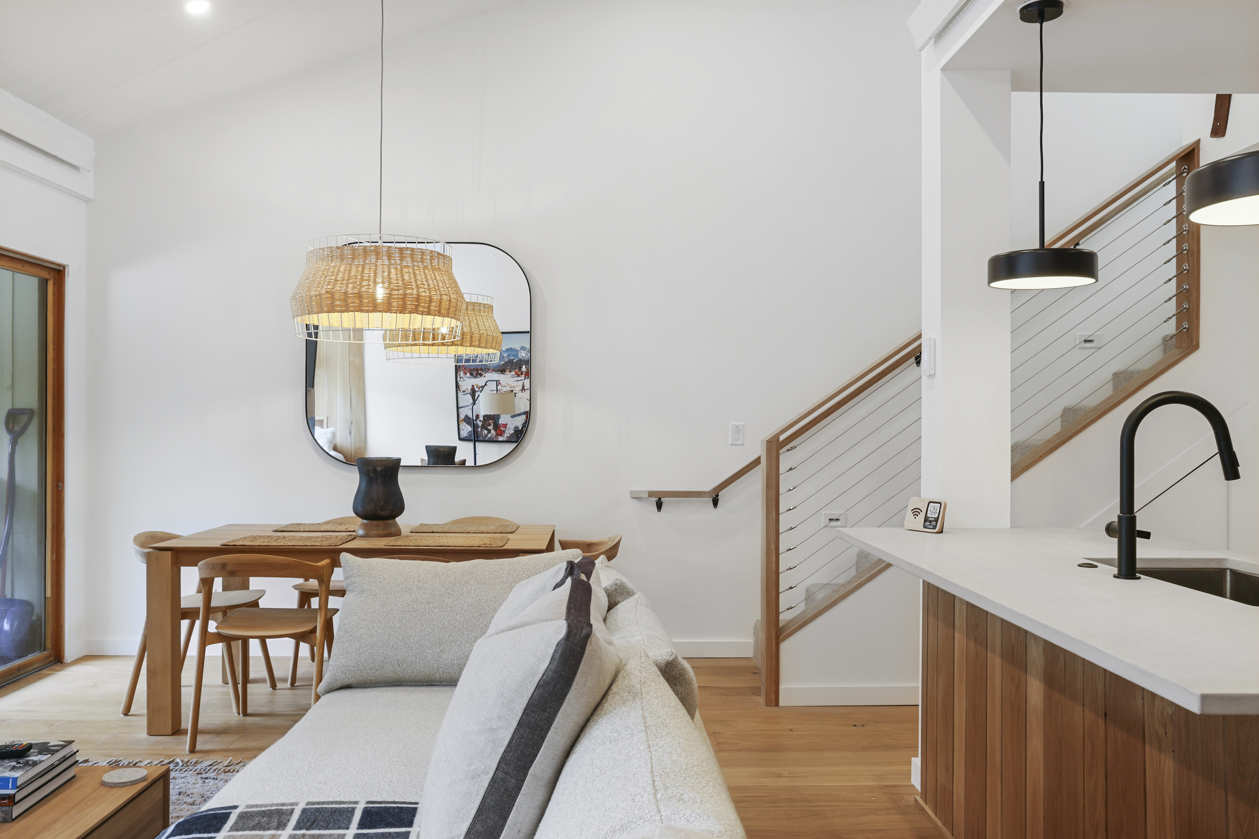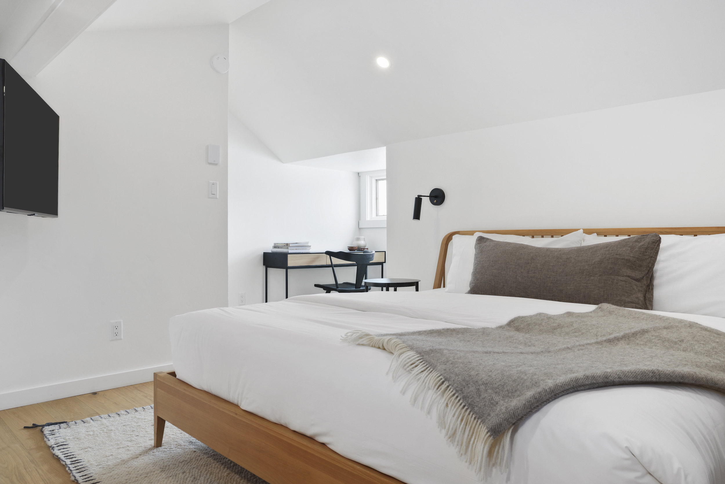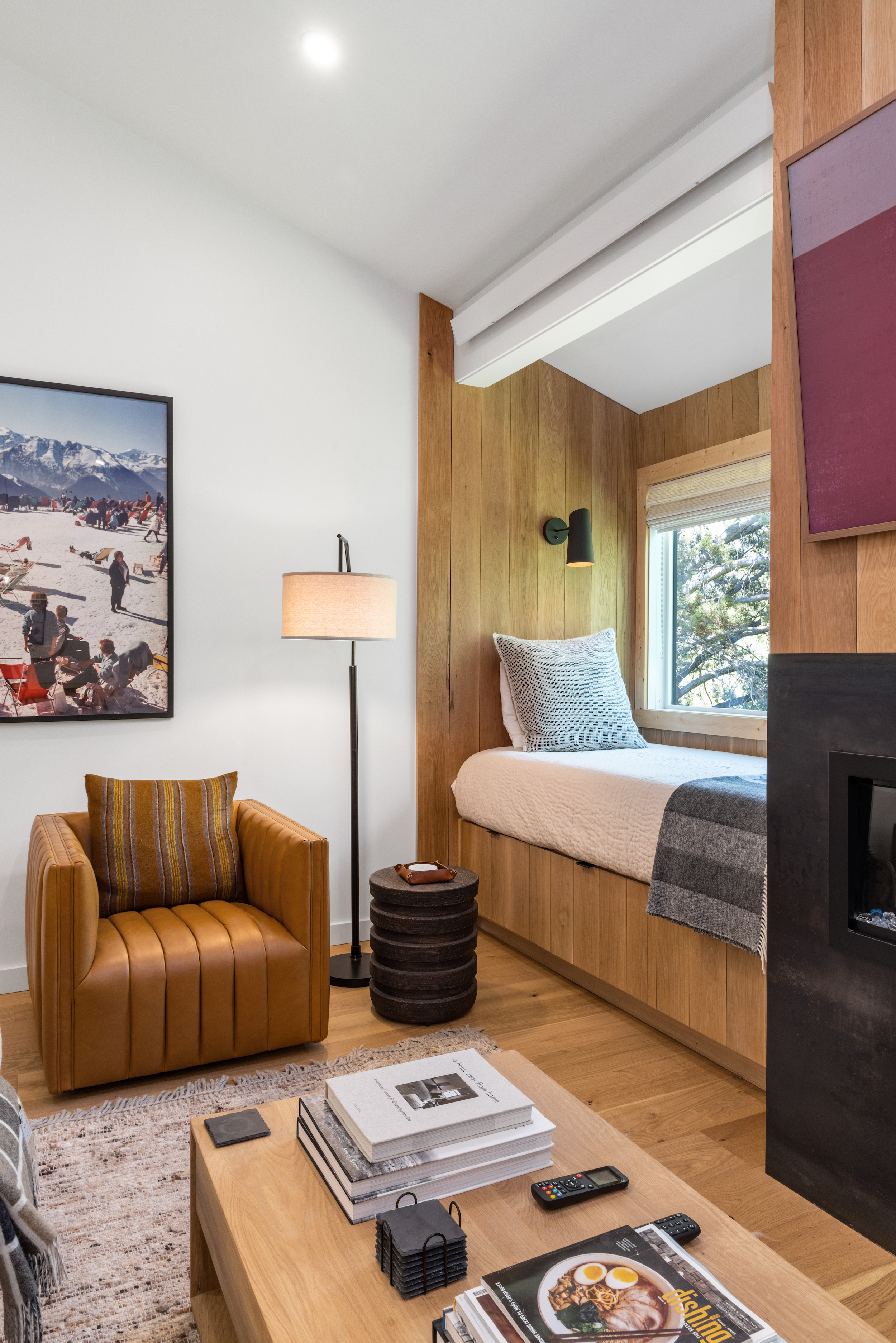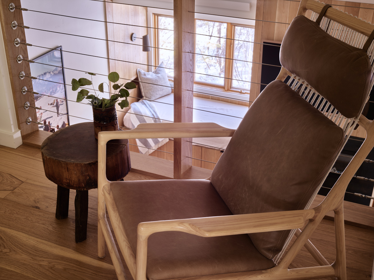 The queen guest bedroom is located on the main level of the home, with an adjacent bathroom. Upstairs, the primary bedroom features a king bed and an ensuite bathroom along with a small sitting area. Please note that the far bedroom wall by the sitting area is open to the main living room, which will allow some noise transfer. A privacy shade has been installed in the window overlooking the living room from the primary bedroom. The living room also provides a twin daybed that can be used as additional sleeping space.