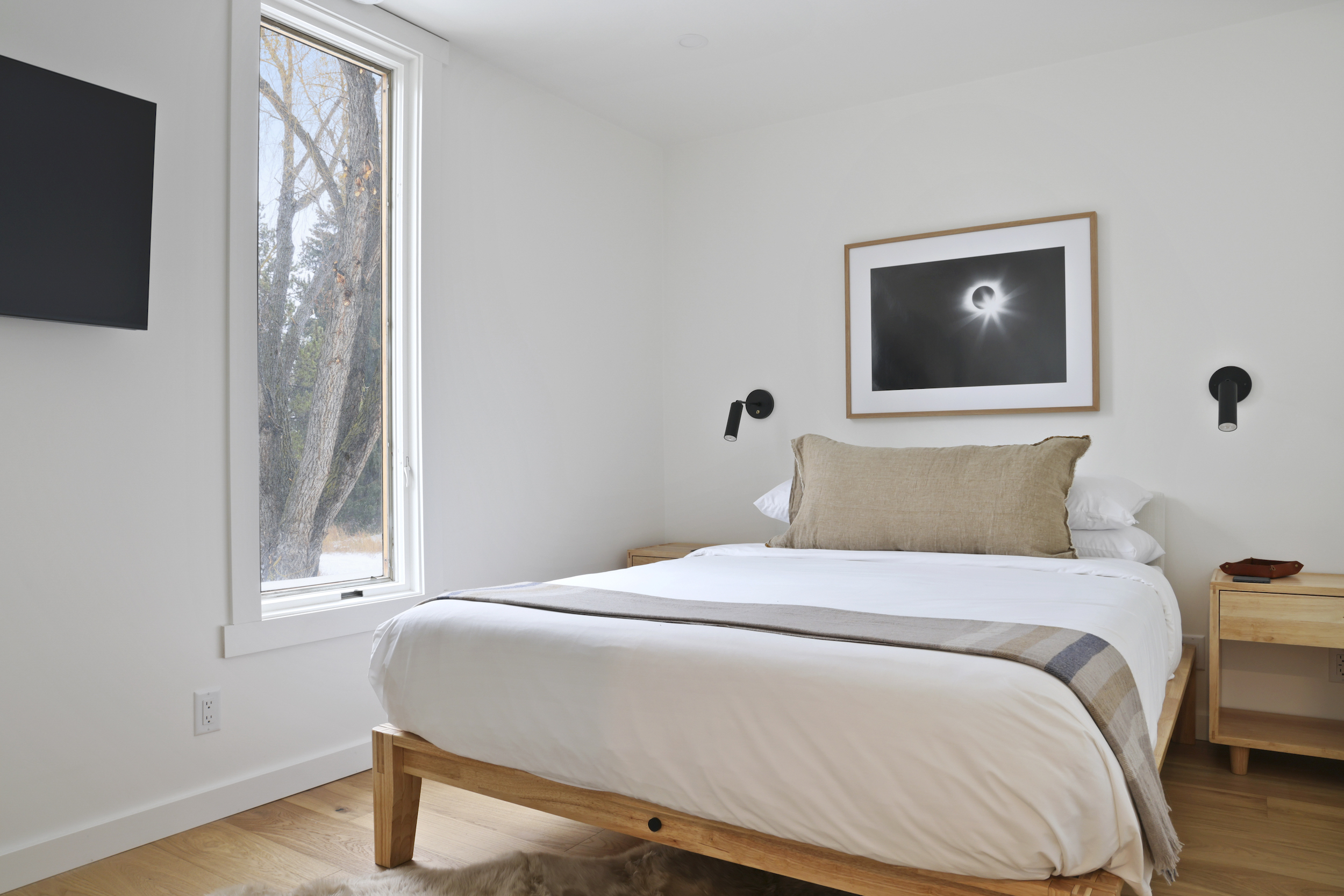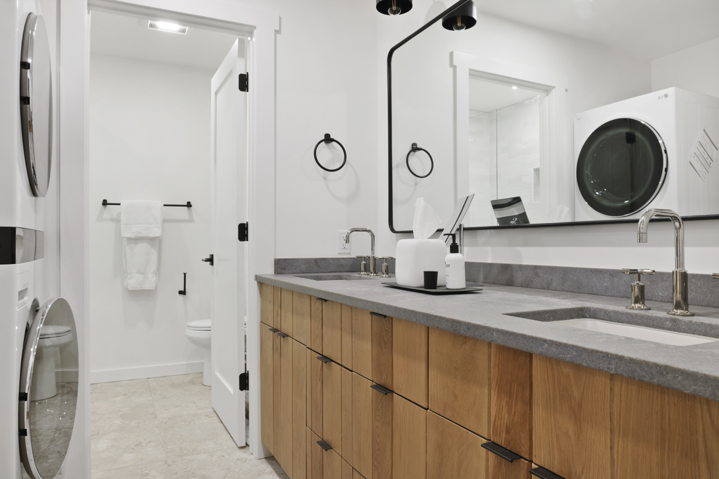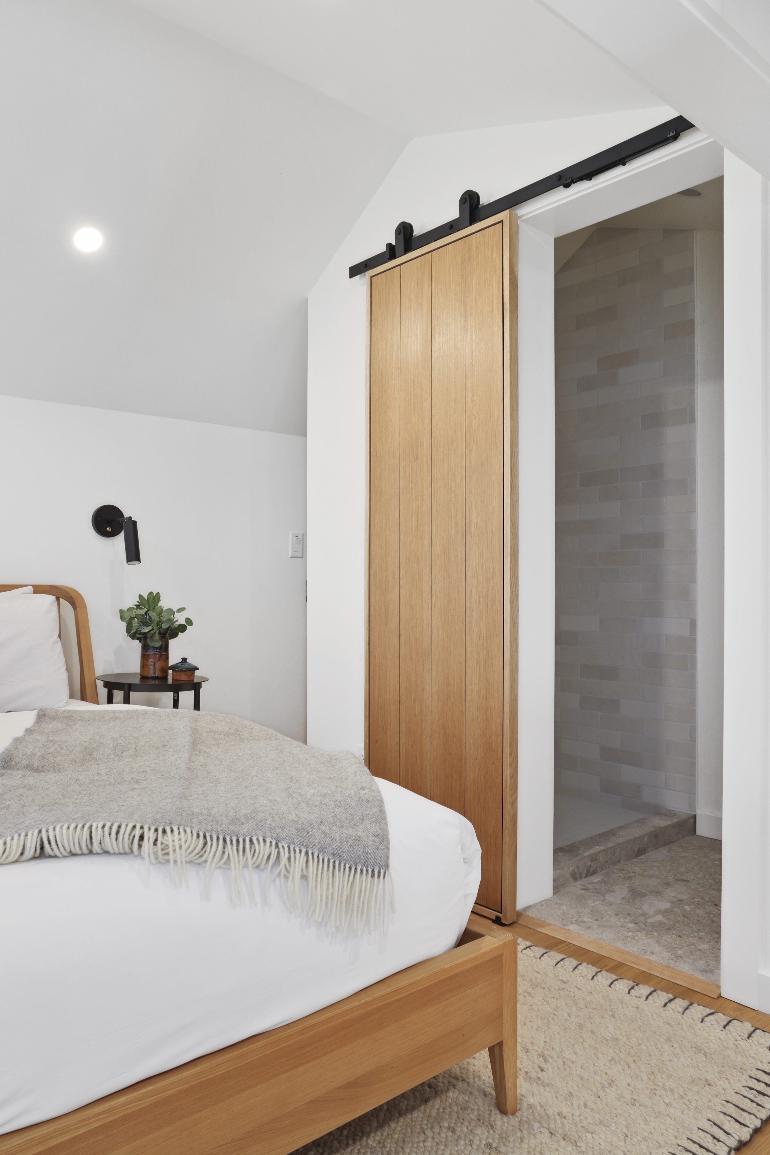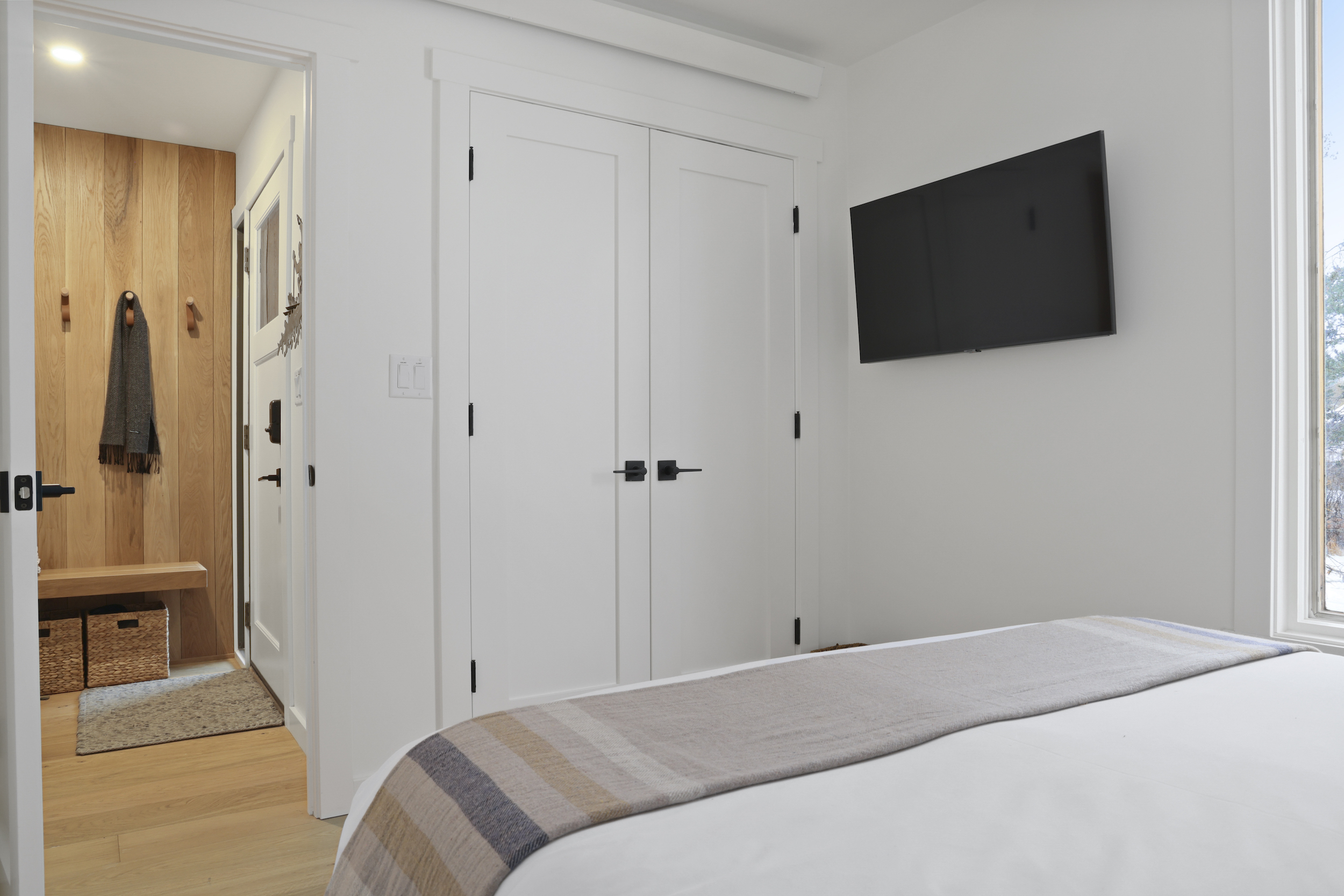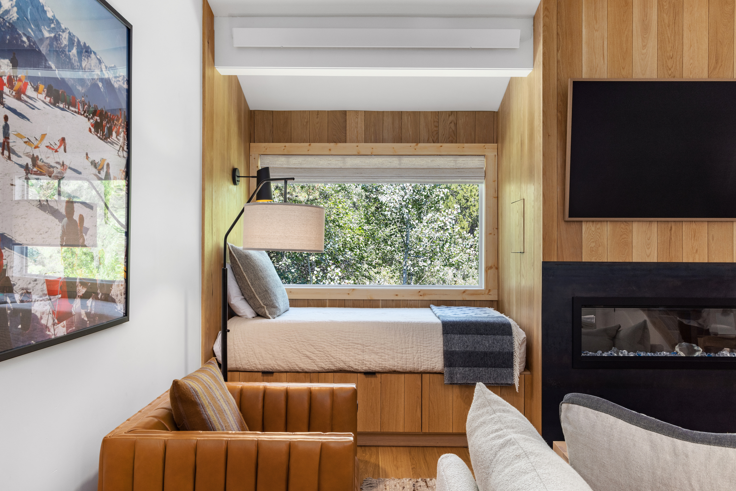 The queen guest bedroom is located on the main level of the home, with an adjacent bathroom. Upstairs, the primary bedroom features a king bed and an ensuite bathroom along with a small sitting area. Please note that the far bedroom wall by the sitting area is open to the main living room, which will allow some noise transfer. A privacy shade has been installed in the window overlooking the living room from the primary bedroom. The living room also provides a twin daybed that can be used as additional sleeping space.