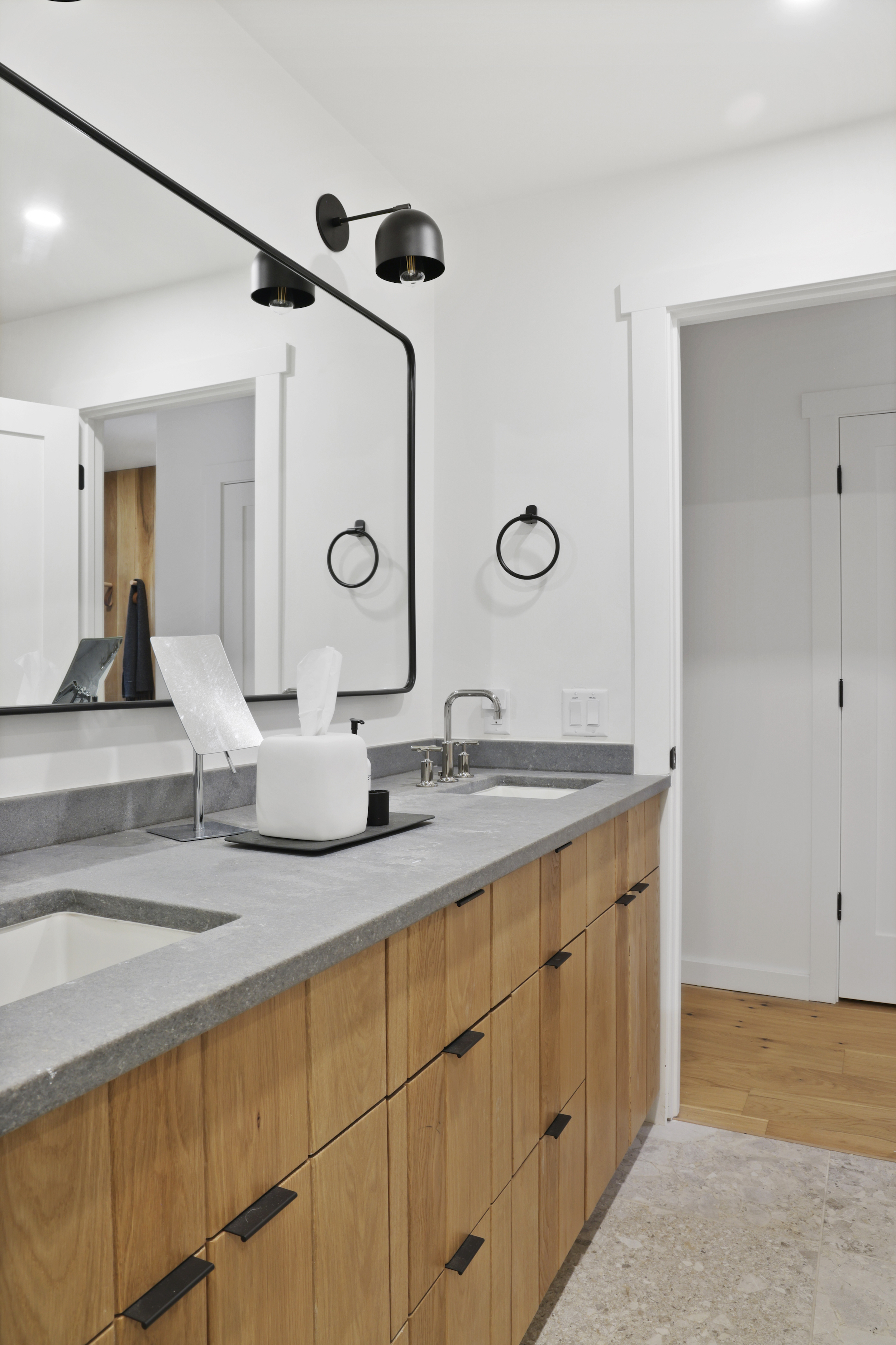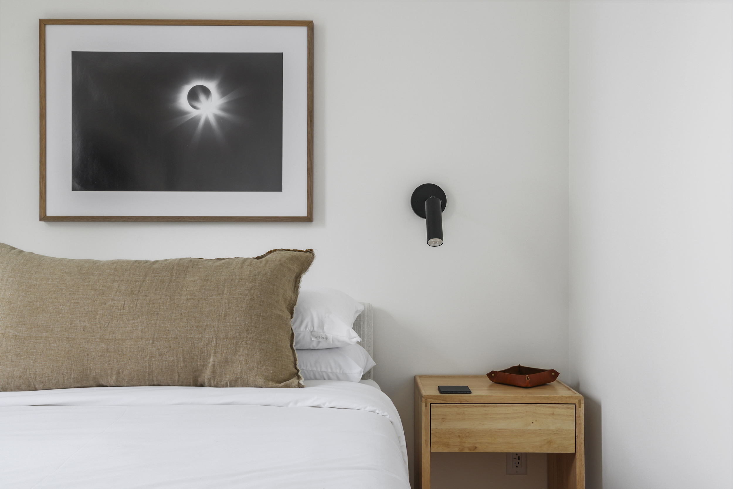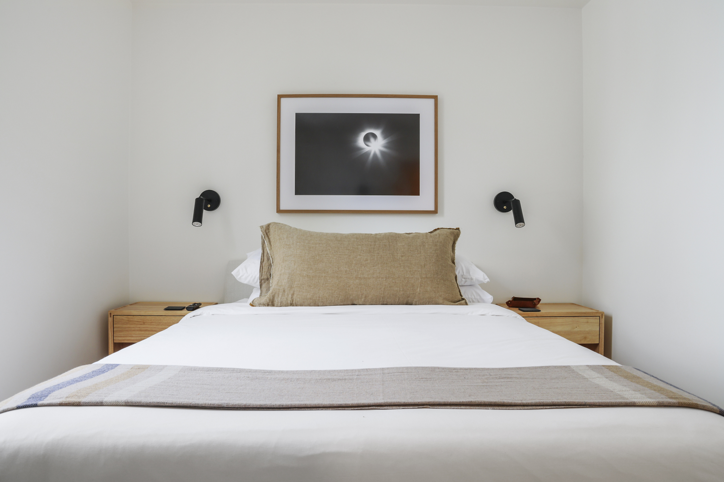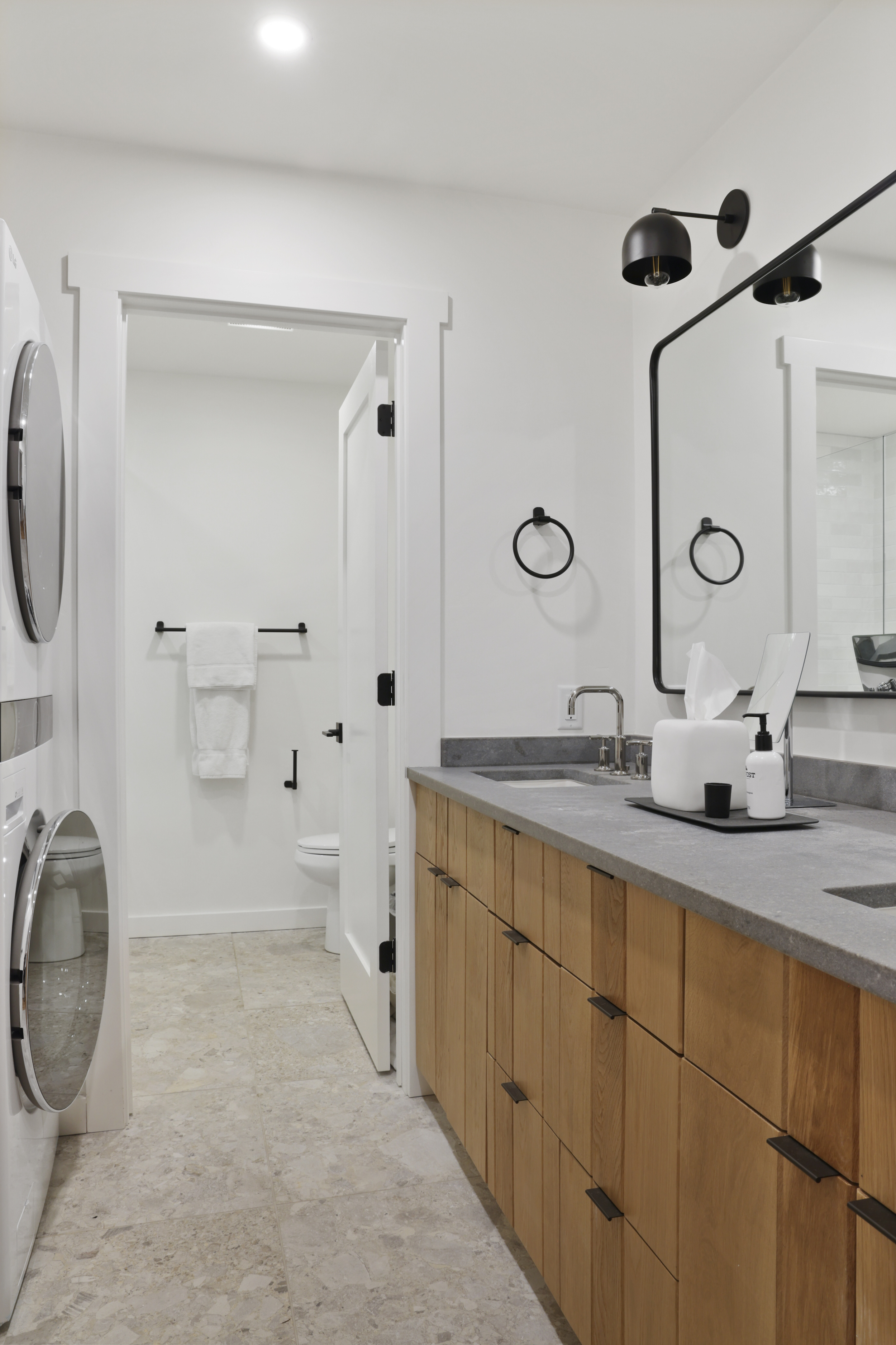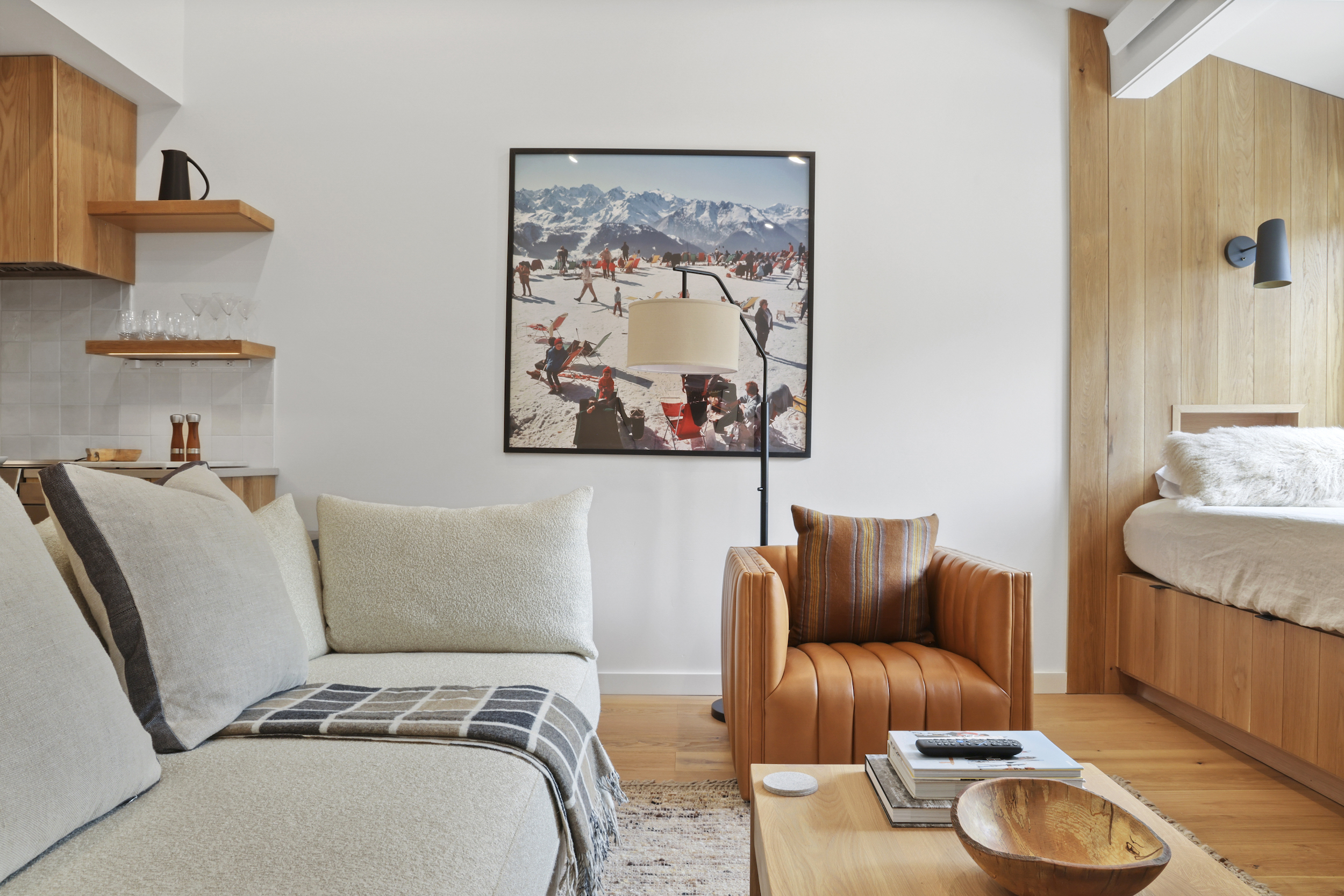 The queen guest bedroom is located on the main level of the home, with an adjacent bathroom. Upstairs, the primary bedroom features a king bed and an ensuite bathroom along with a small sitting area. Please note that the far bedroom wall by the sitting area is open to the main living room, which will allow some noise transfer. A privacy shade has been installed in the window overlooking the living room from the primary bedroom. The living room also provides a twin daybed that can be used as additional sleeping space.