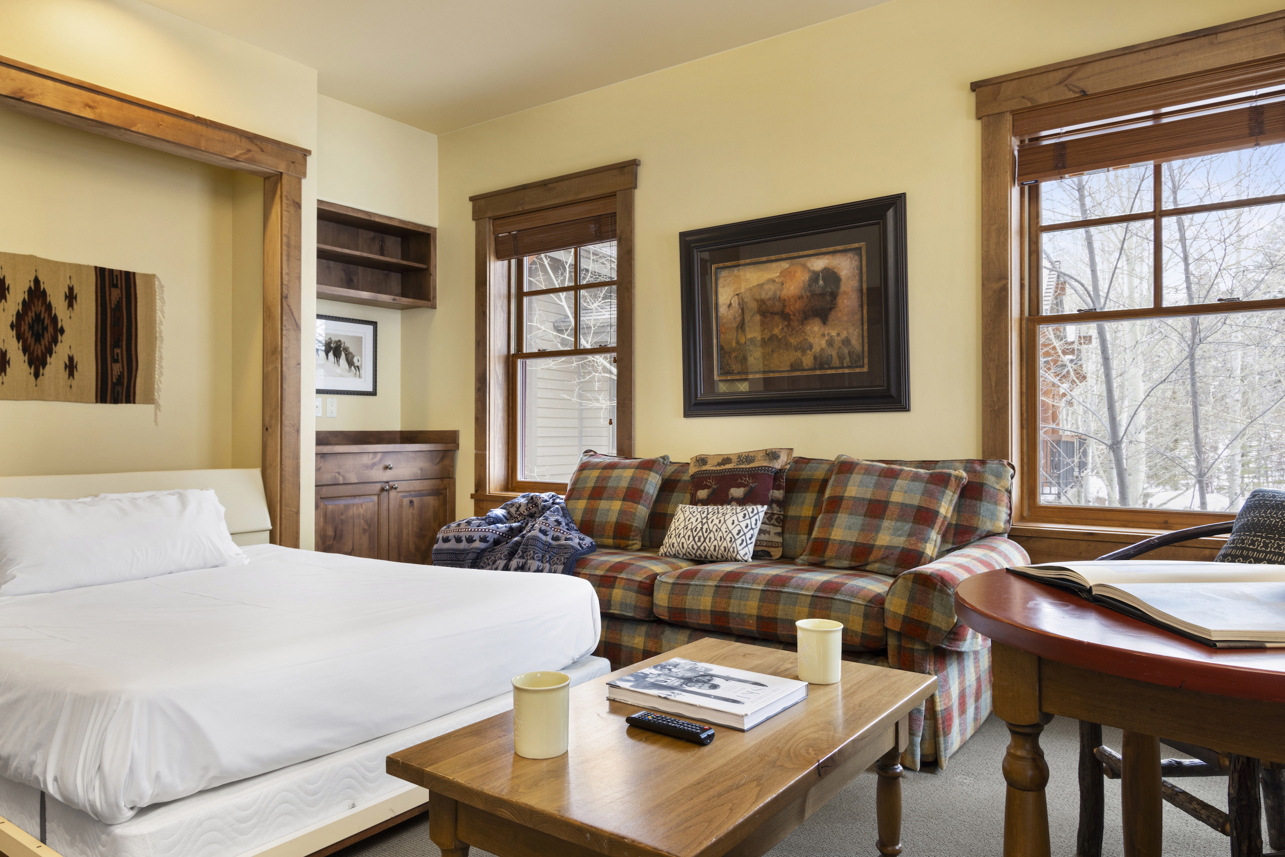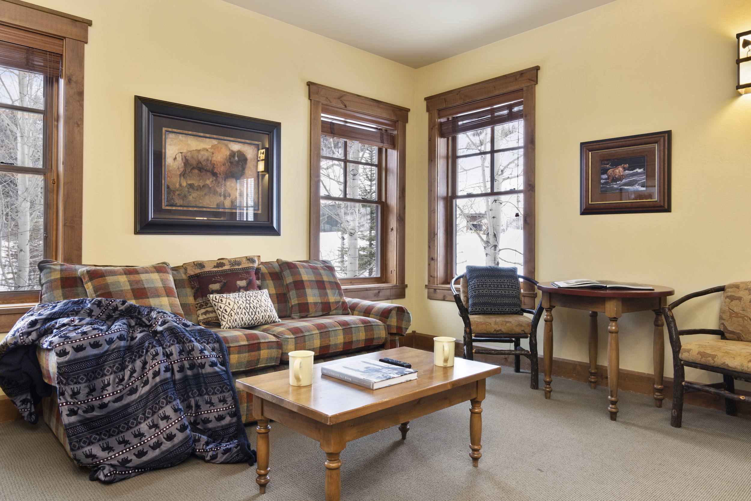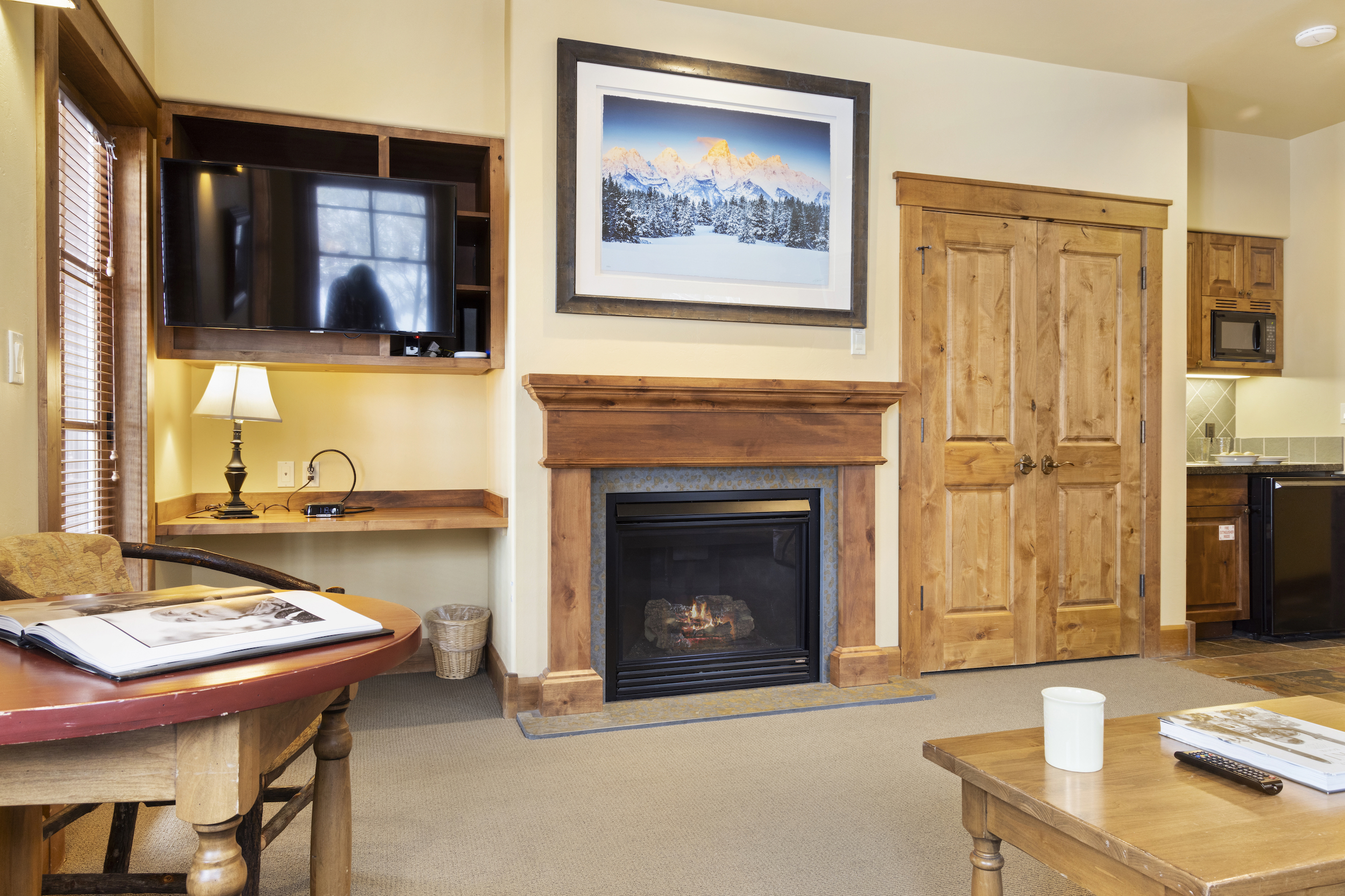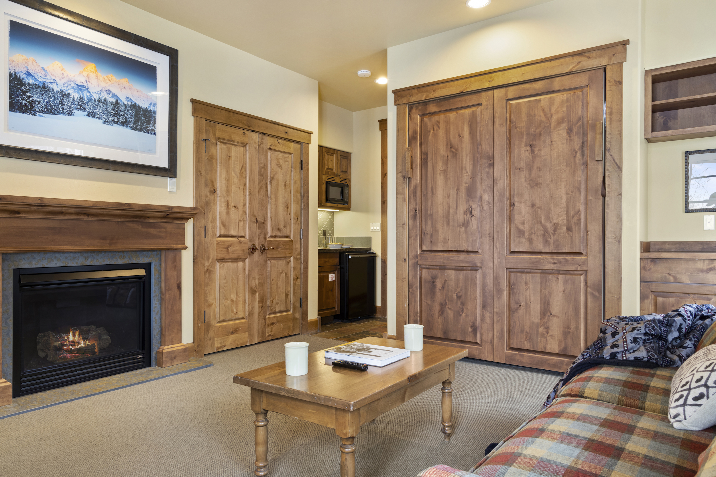 This top floor Grand View condo is nestled conveniently at the base of Snow King Mountain and walking distance to town square. The expansive, 1748 square-foot floor plan offers multiple sleeping arrangements and entertainment options making it suitable for various guests and occasions. The second living room also doubles as the murphy bed bedroom. Look out at the Tetons from the terrace or curl up by the fireplace in the winter. A cozy accommodation option in a wonderful location, Grand View 494 is the perfect outpost for your Jackson Hole vacation.