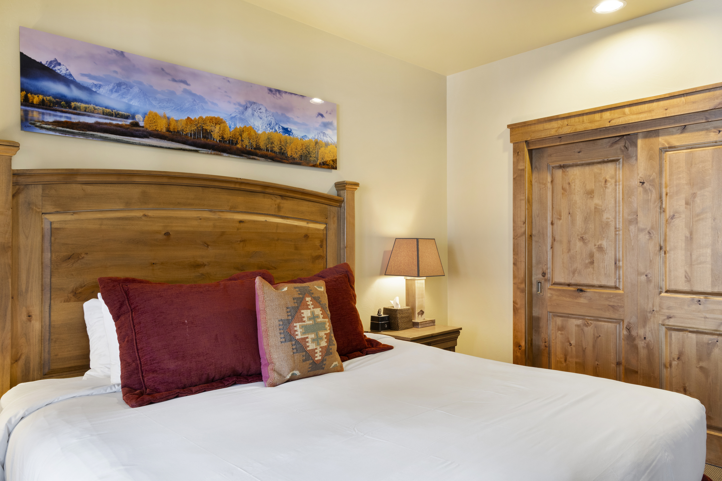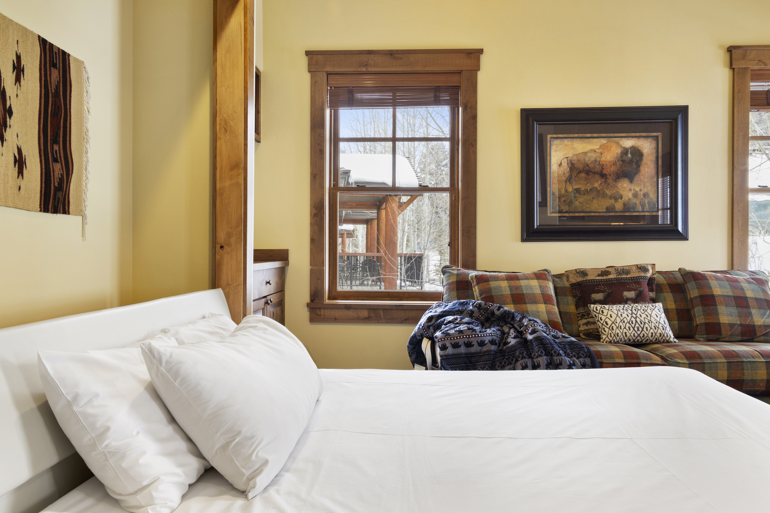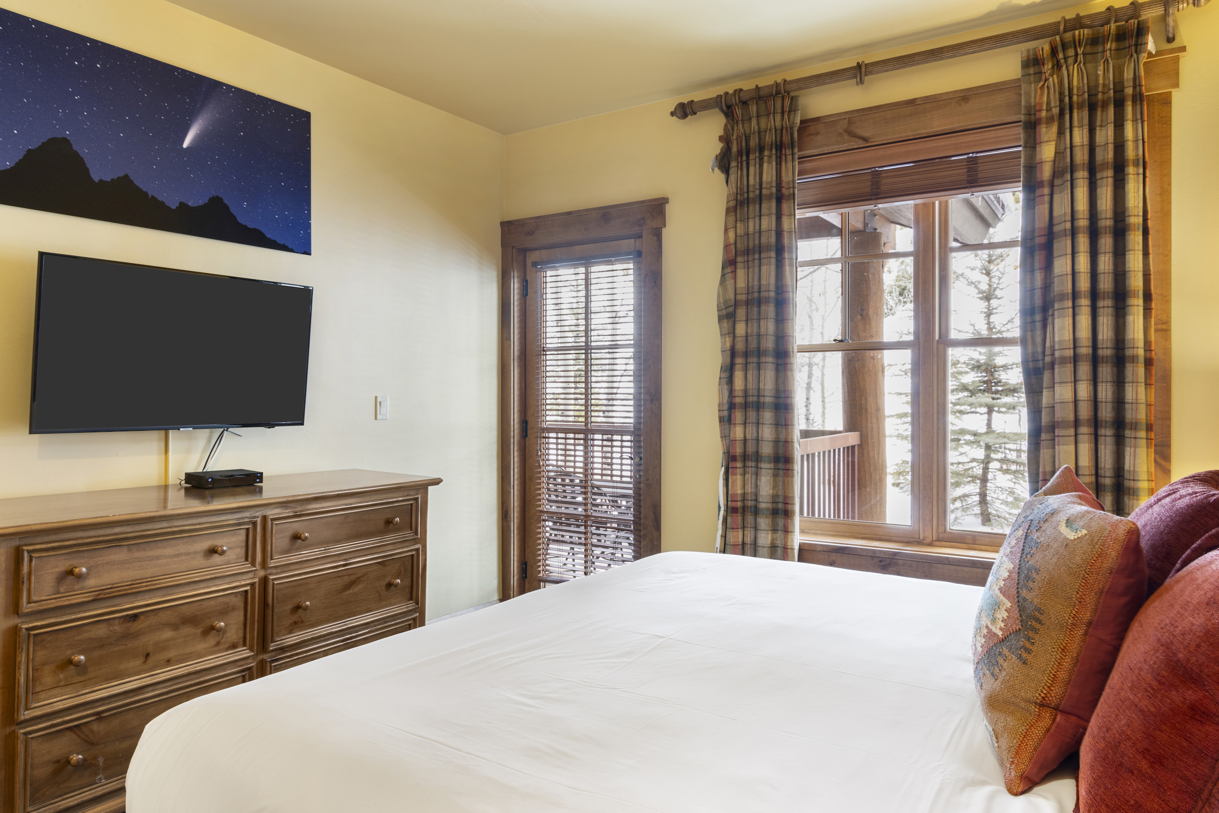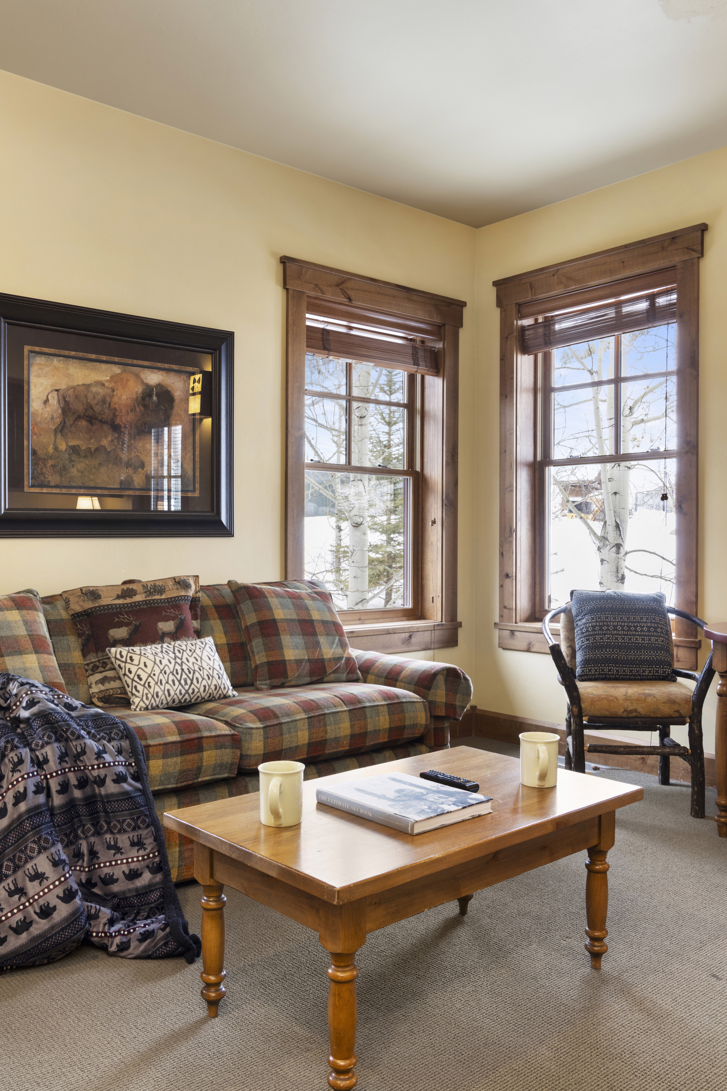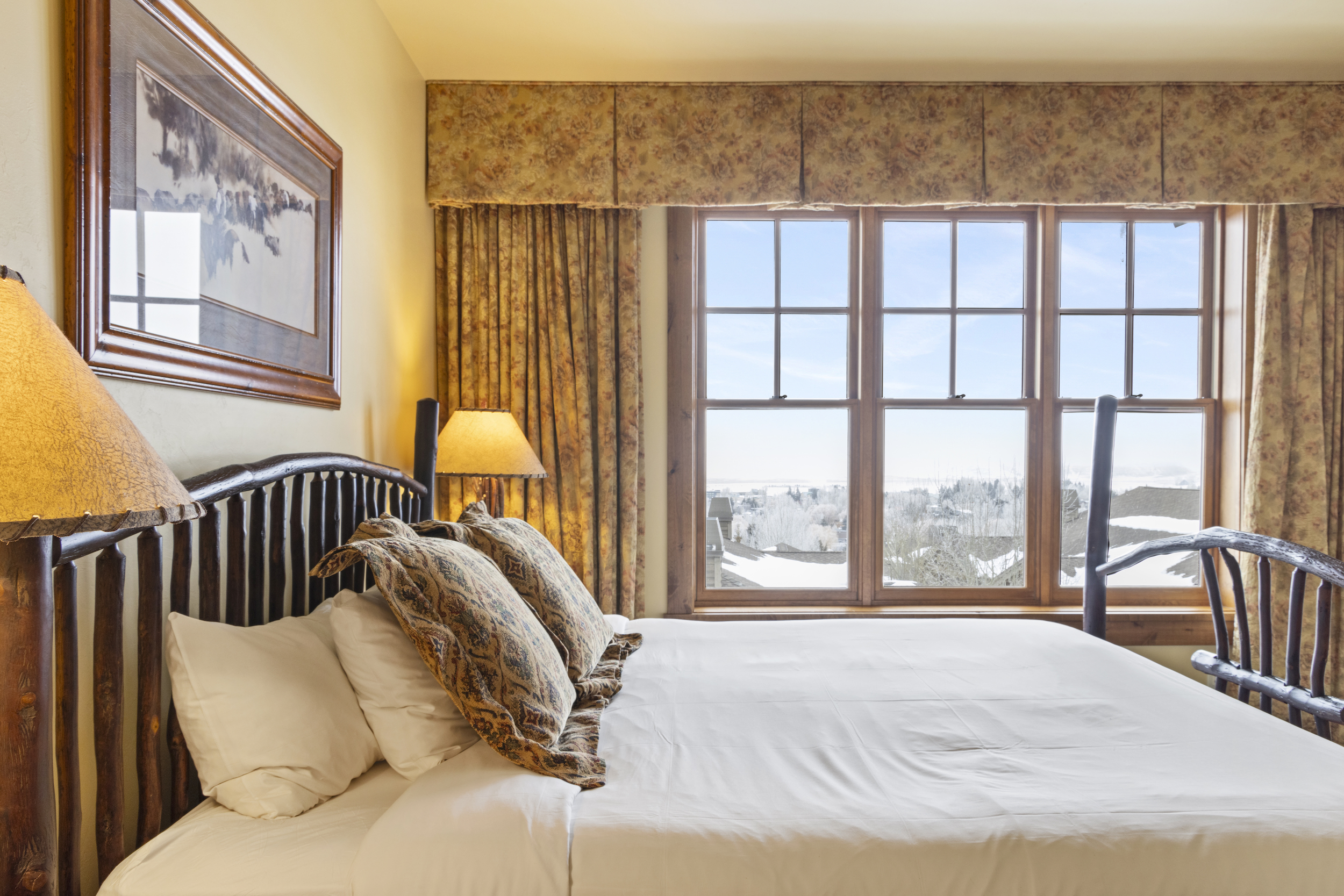 This top floor Grand View condo is nestled conveniently at the base of Snow King Mountain and walking distance to town square. The expansive, 1748 square-foot floor plan offers multiple sleeping arrangements and entertainment options making it suitable for various guests and occasions. The second living room also doubles as the murphy bed bedroom. Look out at the Tetons from the terrace or curl up by the fireplace in the winter. A cozy accommodation option in a wonderful location, Grand View 494 is the perfect outpost for your Jackson Hole vacation.
