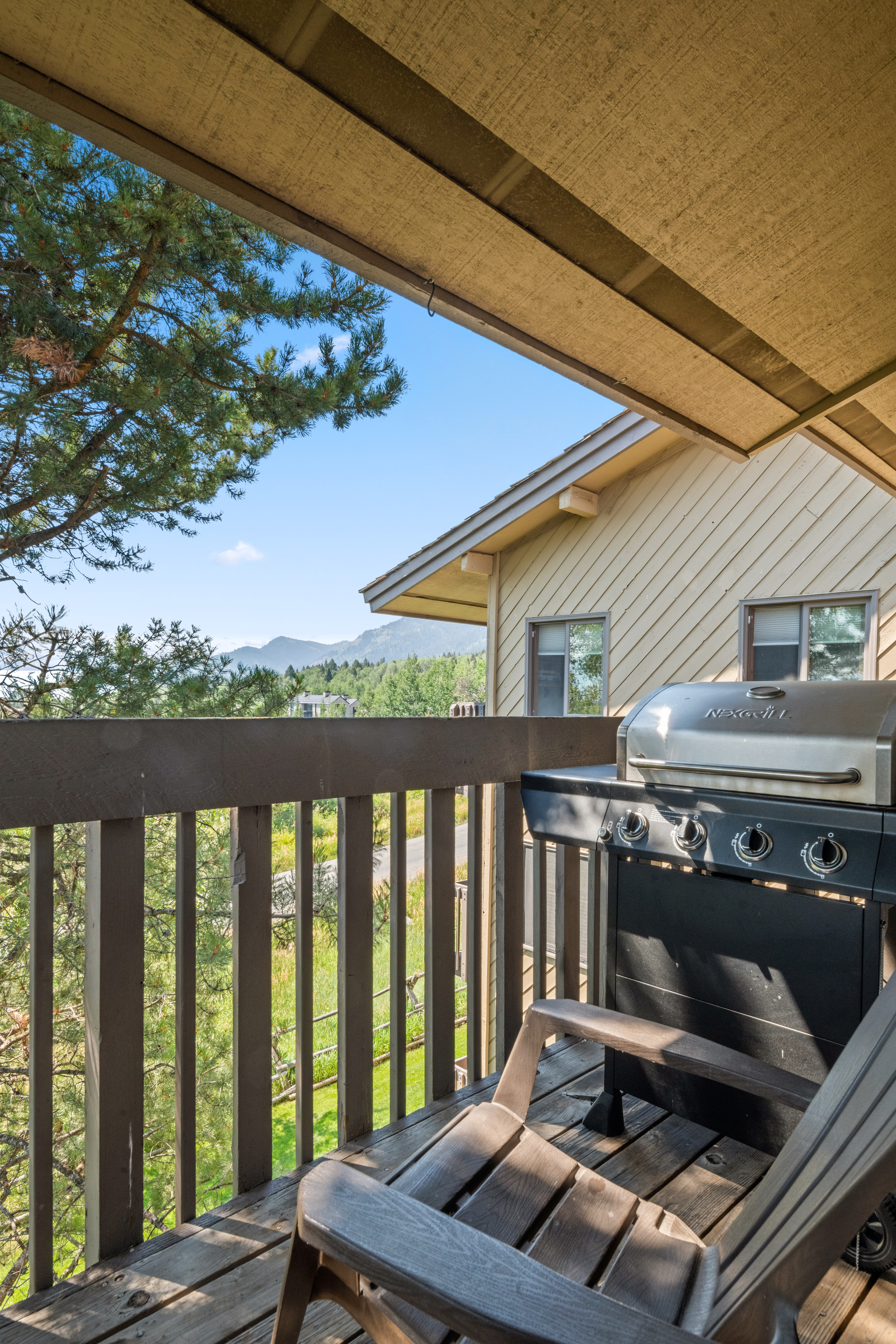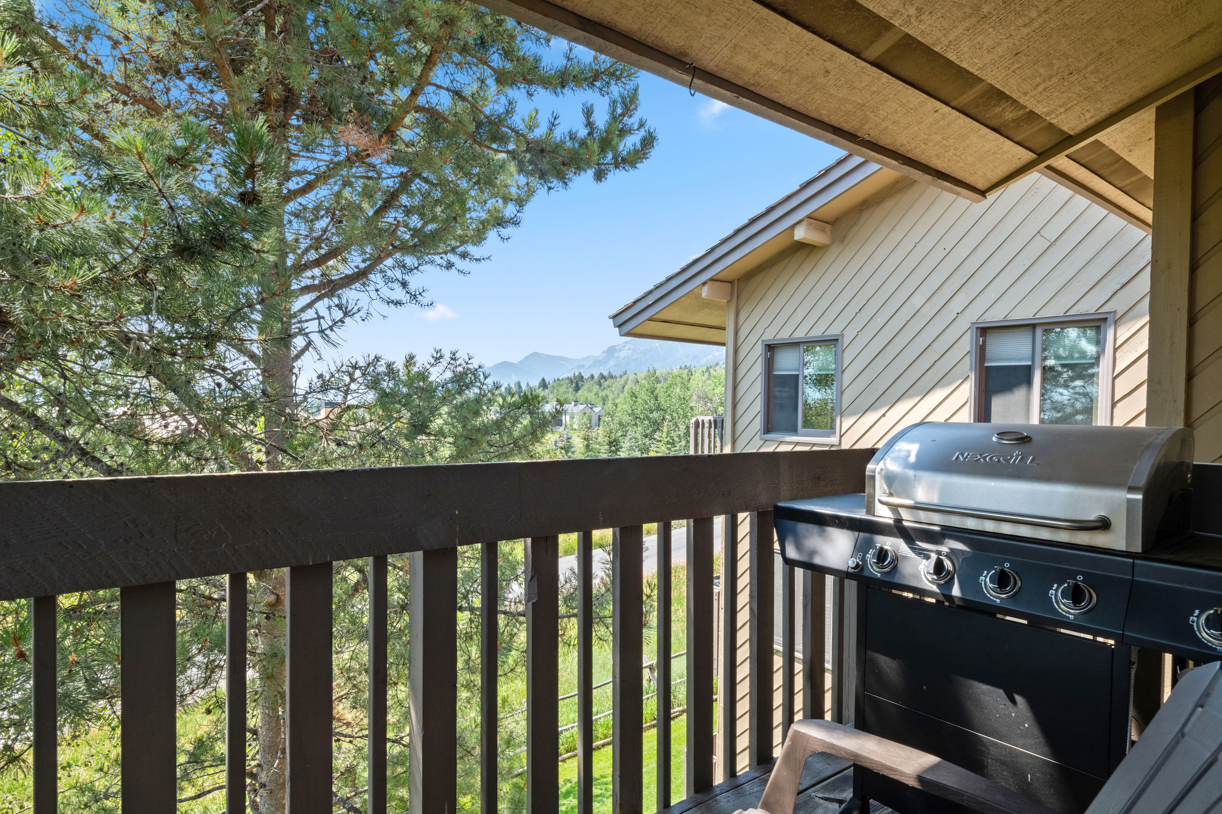 This top floor two-bedroom, two-bath, 900 square-foot unit features a primary bedroom with a queen-sized bed, an additional bedroom with two single beds, a full kitchen, and an inviting living space with a queen pullout couch to sleep extra guests. There is also a balcony with a gas grill that overlooks the Jackson Hole valley, plenty of storage inside the unit, and outdoor lockable storage. Curl up by the electric fireplace on cool Teton evenings. You'll love unwinding after a day on the slopes or hiking trails.