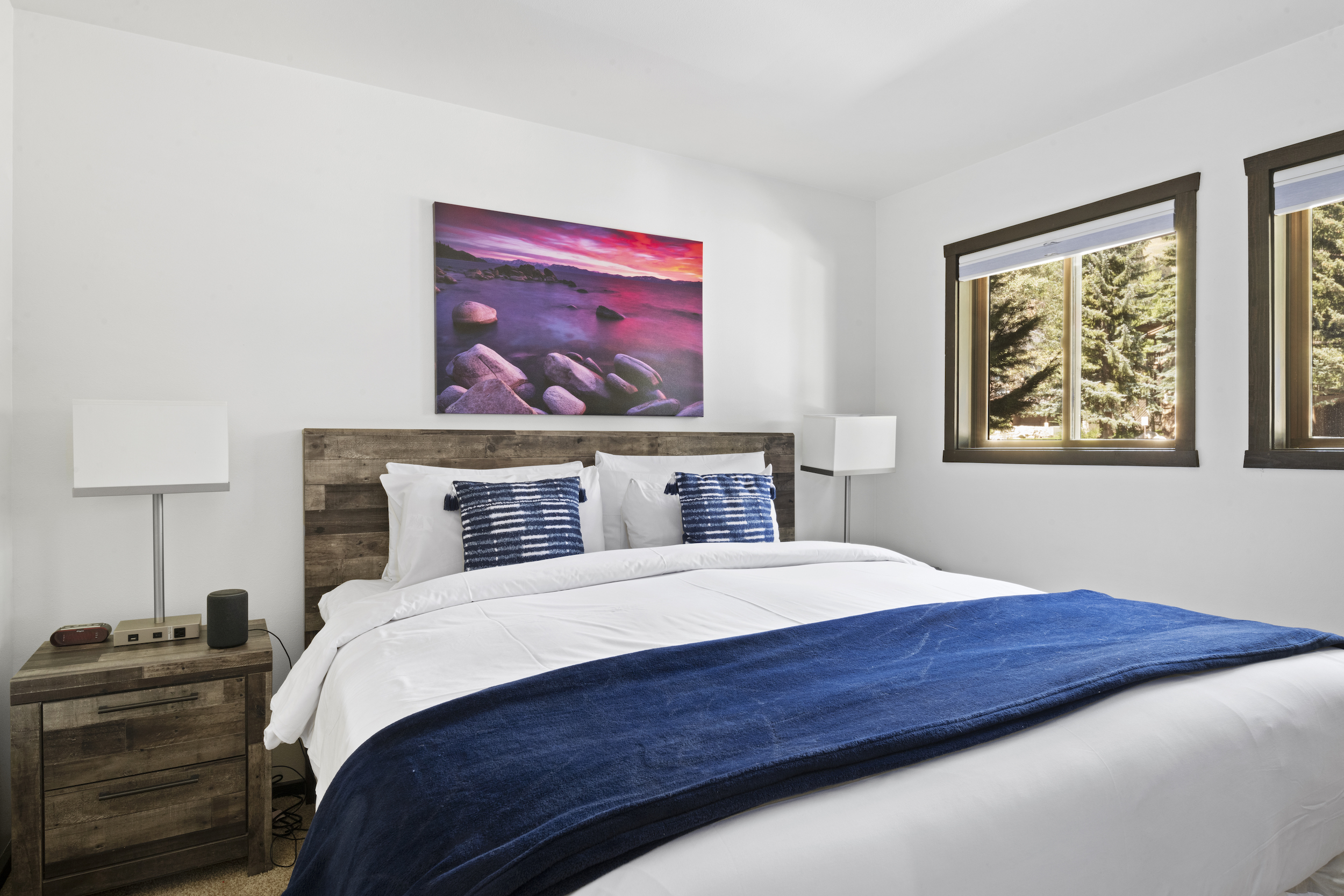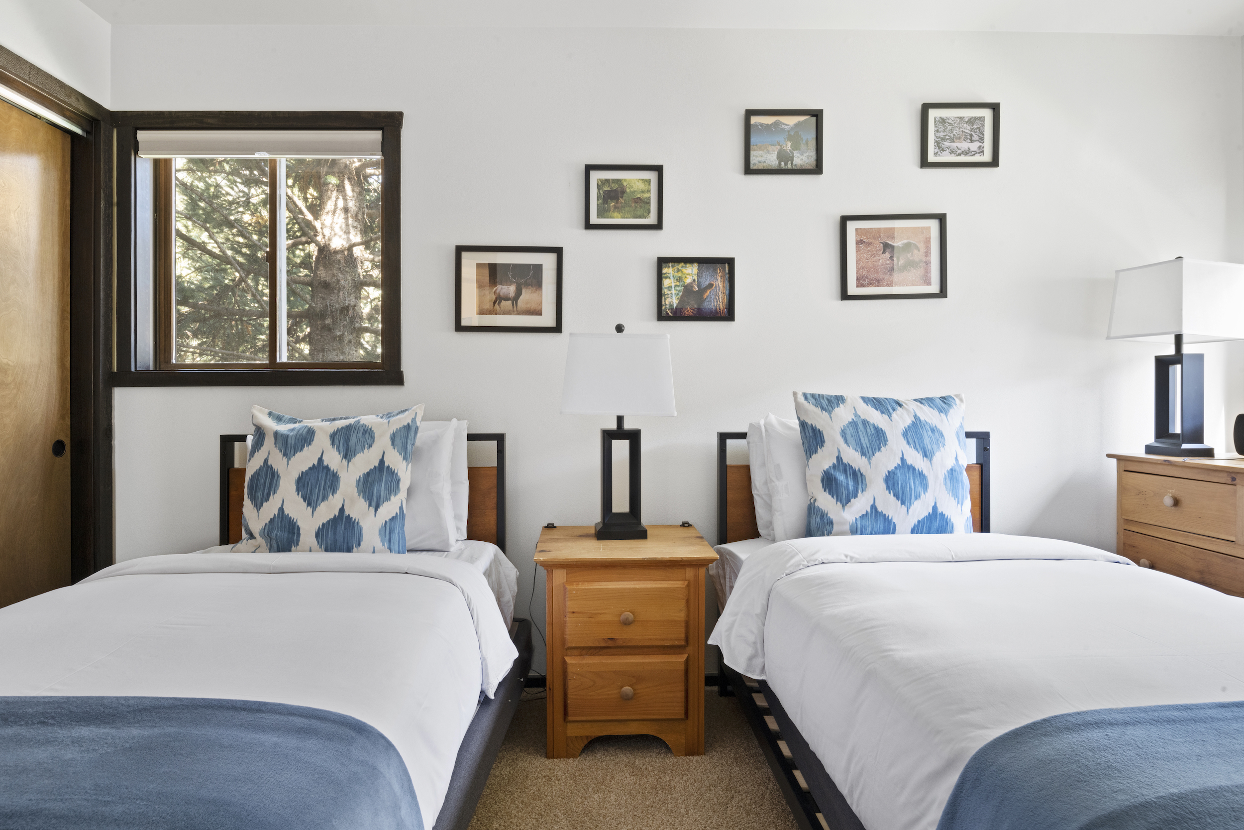 This comfortable two-bedroom, two-bath, 900 square-foot unit features a primary bedroom with a king-sized bed, an additional bedroom with two twin beds, a kitchen open to the living area, and an inviting living space with a queen pullout couch to sleep extra guests. There is also a balcony with a gas grill that overlooks the Jackson Hole valley, plenty of storage inside the unit, and outdoor lockable storage with room for skis and other gear. Curl up by the large stone fireplace on cool Teton evenings. You'll love unwinding at Sleeping Indian E8 after a day on the slopes or hiking trails. The unit entrance is accessible via outdoor stairs, allowing you to get to your accommodation without having to pass through any indoor common areas.