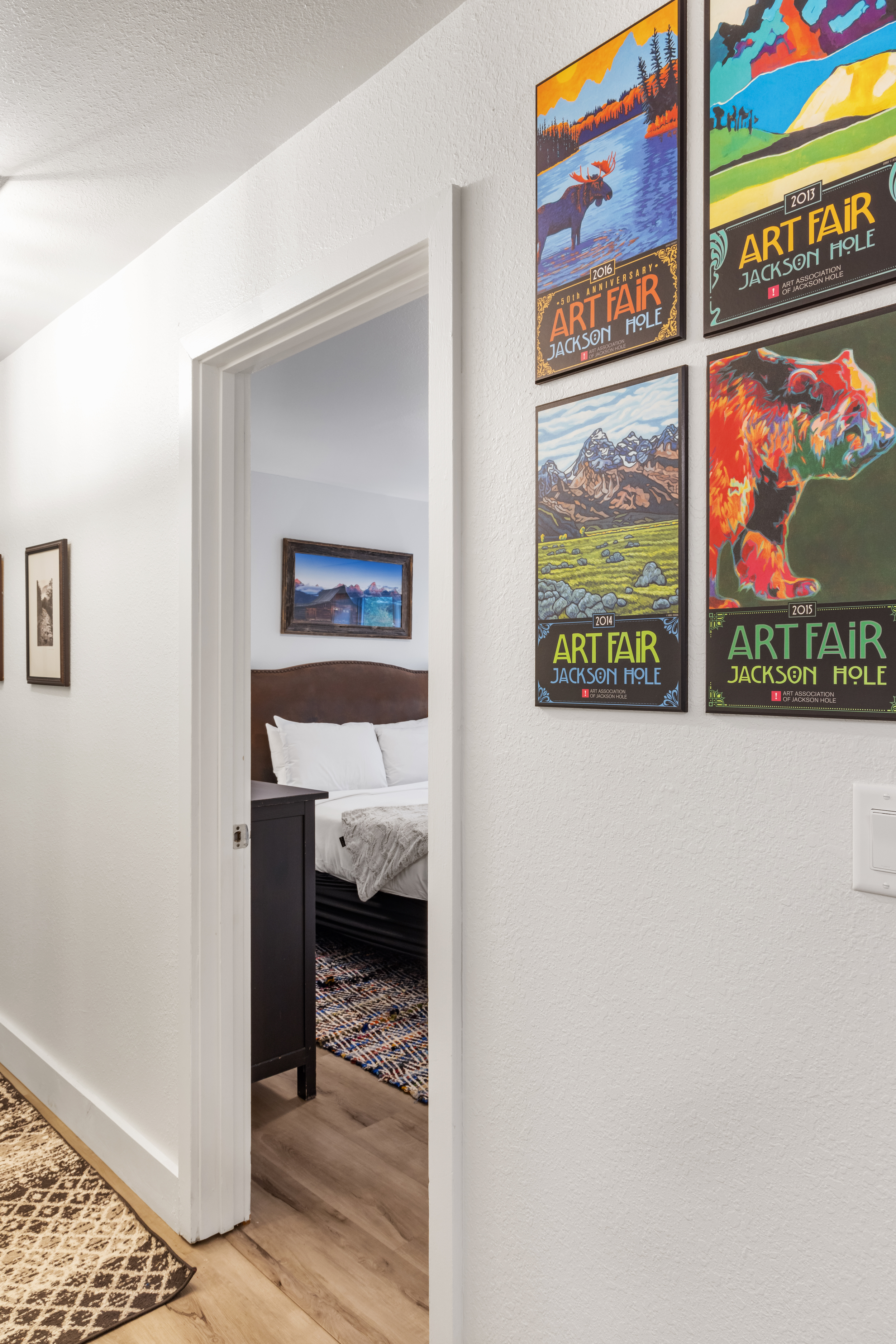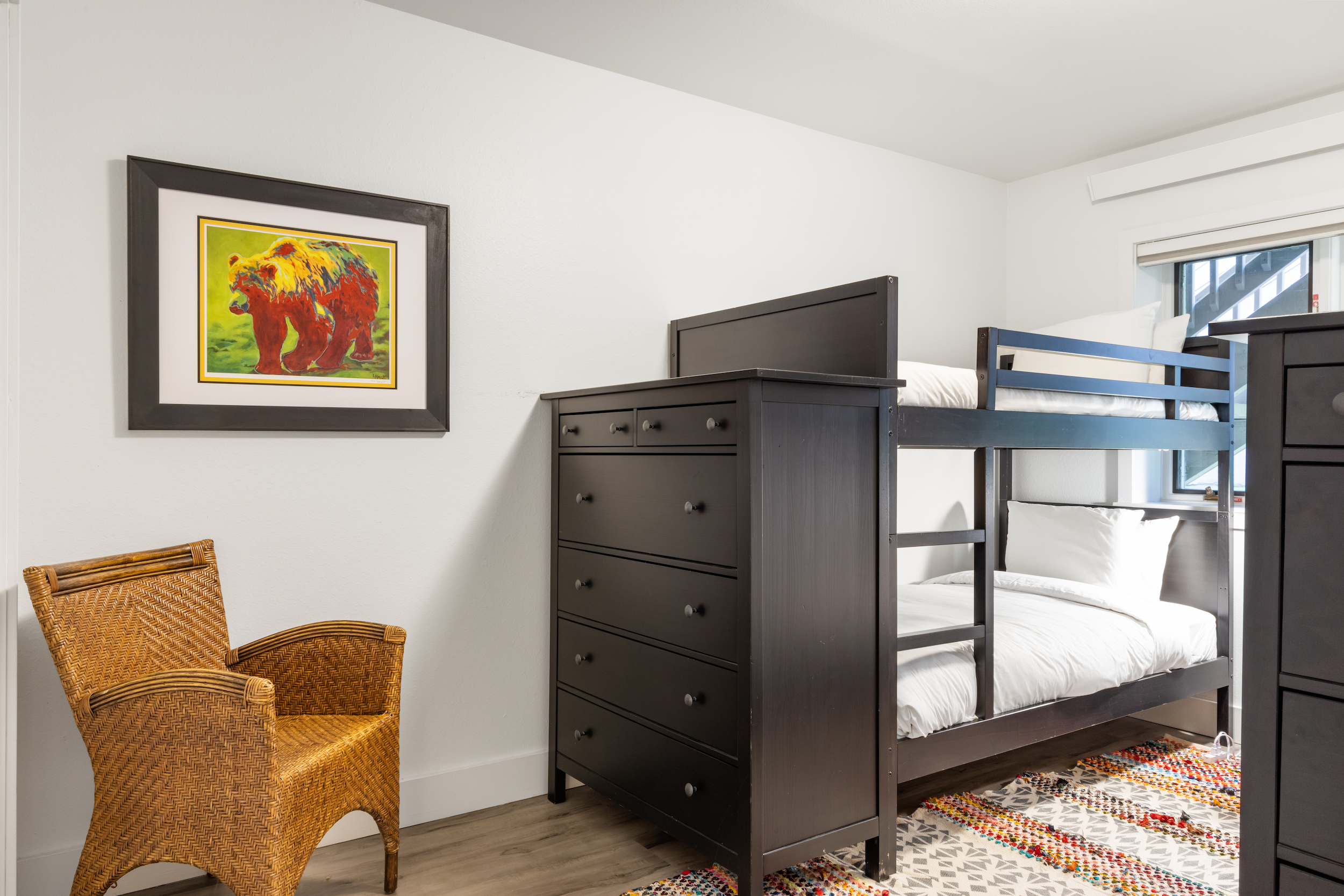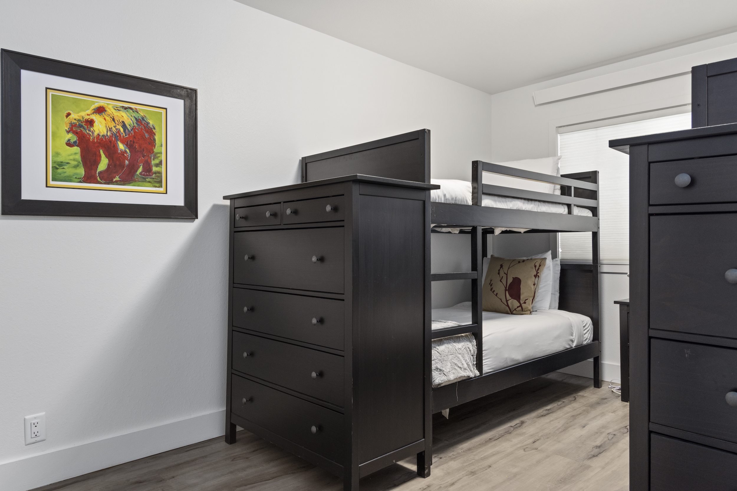 The unit features a primary bedroom with a king sized bed, a second bedroom with a queen, and a third bedroom with two sets of bunk beds. The charming condo is perfect for a family looking to explore all Jackson Hole has to offer.