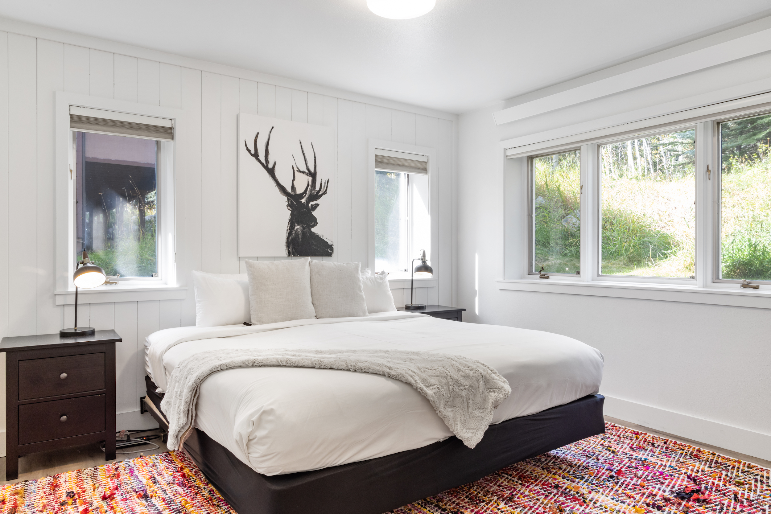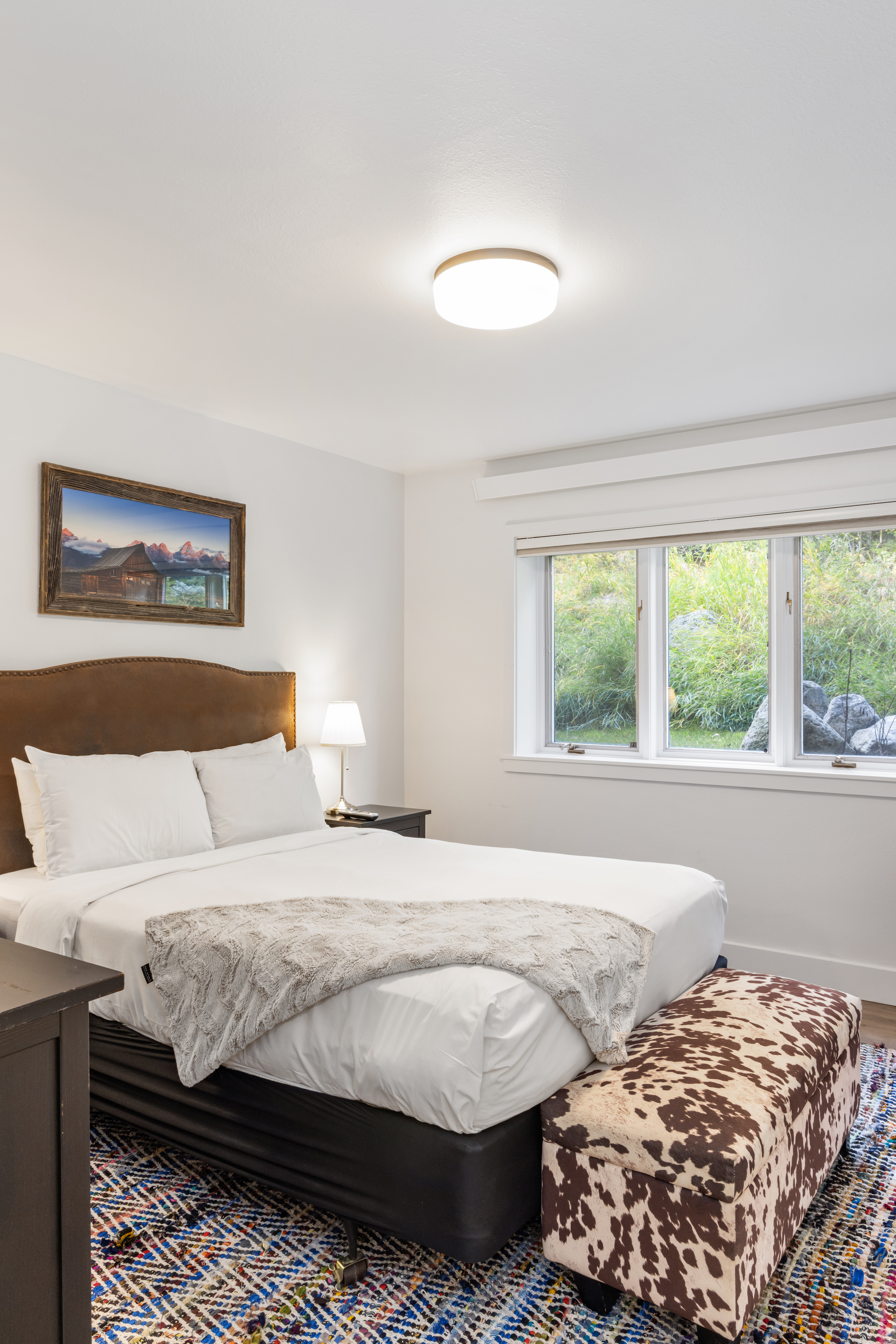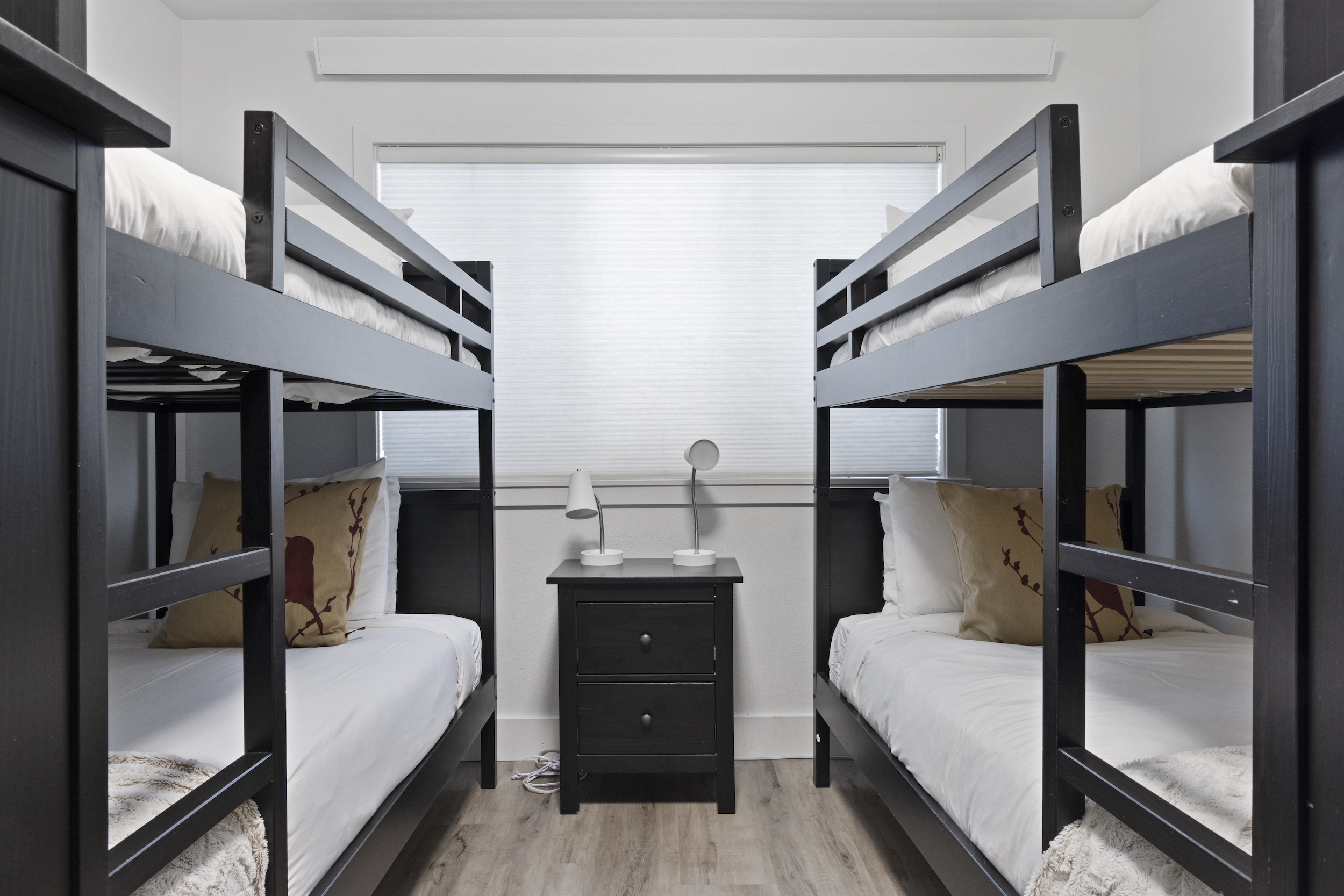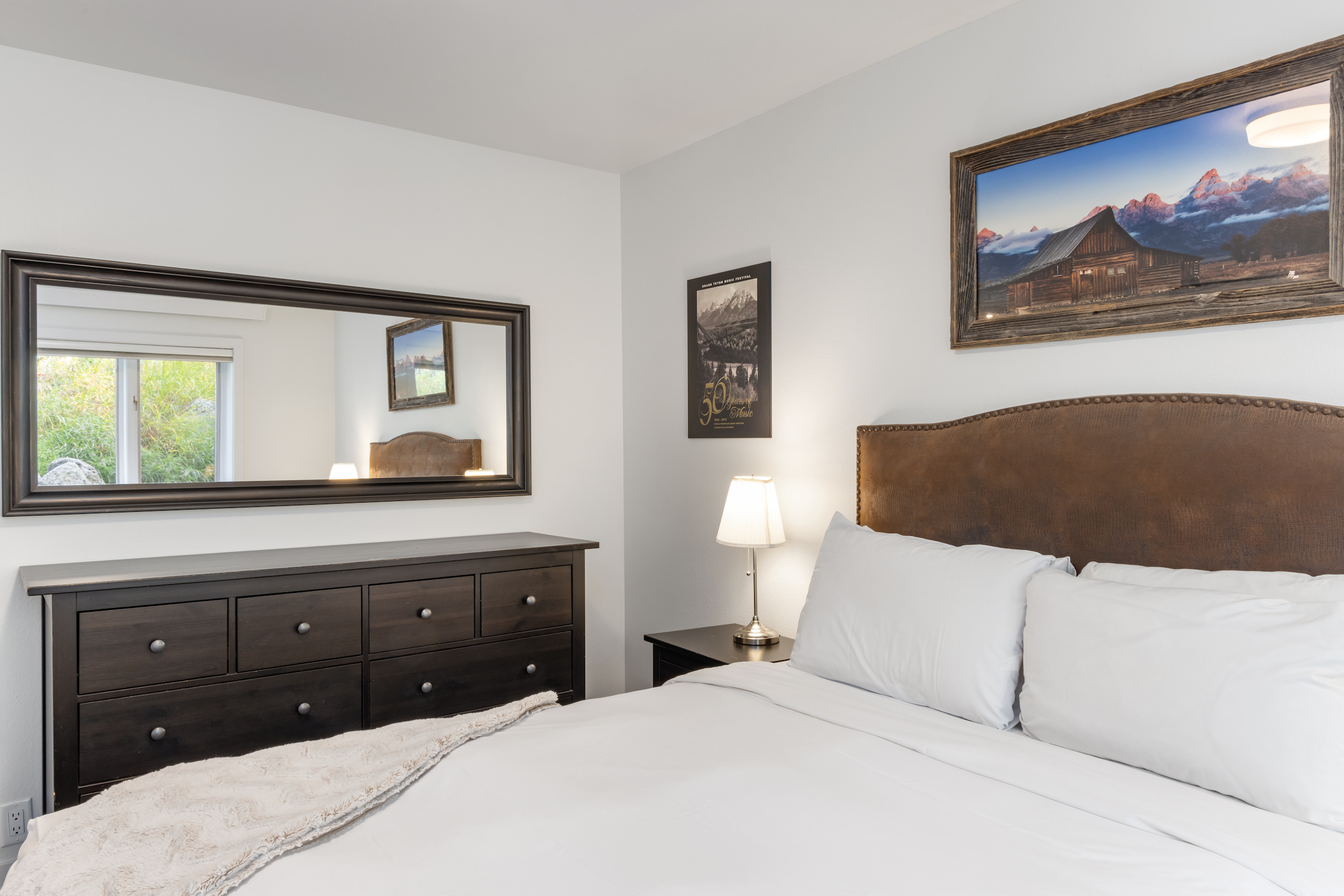 The unit features a primary bedroom with a king sized bed, a second bedroom with a queen, and a third bedroom with two sets of bunk beds. The charming condo is perfect for a family looking to explore all Jackson Hole has to offer.